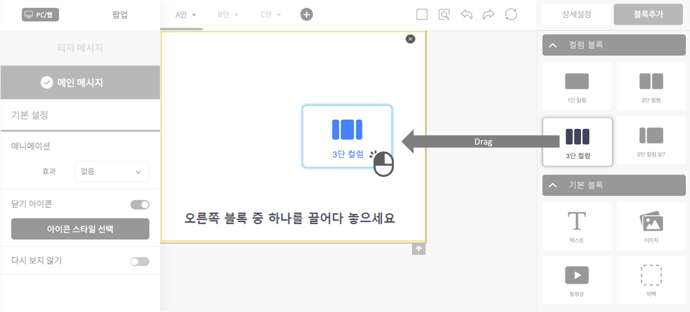그루비 에디터에서 만드는 메시지는 블록으로 구성되며, 블록 안에 요소를 추가하여 메시지를 디자인을 쉽고 빠르게 만들 수 있습니다.