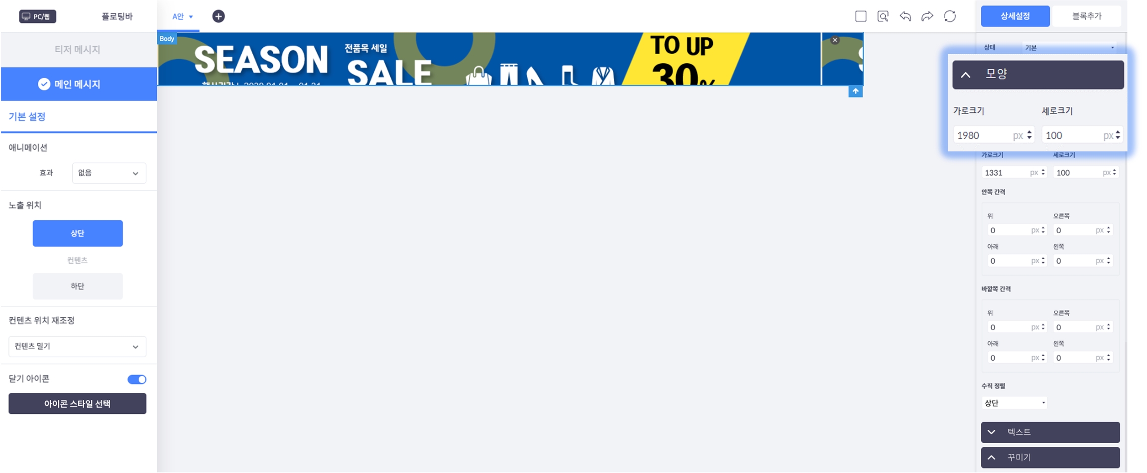 추가한 CTA 버튼에 링크 주소와 버튼 클릭 시 열기 형태(현재 창으로 열기 & 새창으로 열기)를 설정 할 수 있습니다.