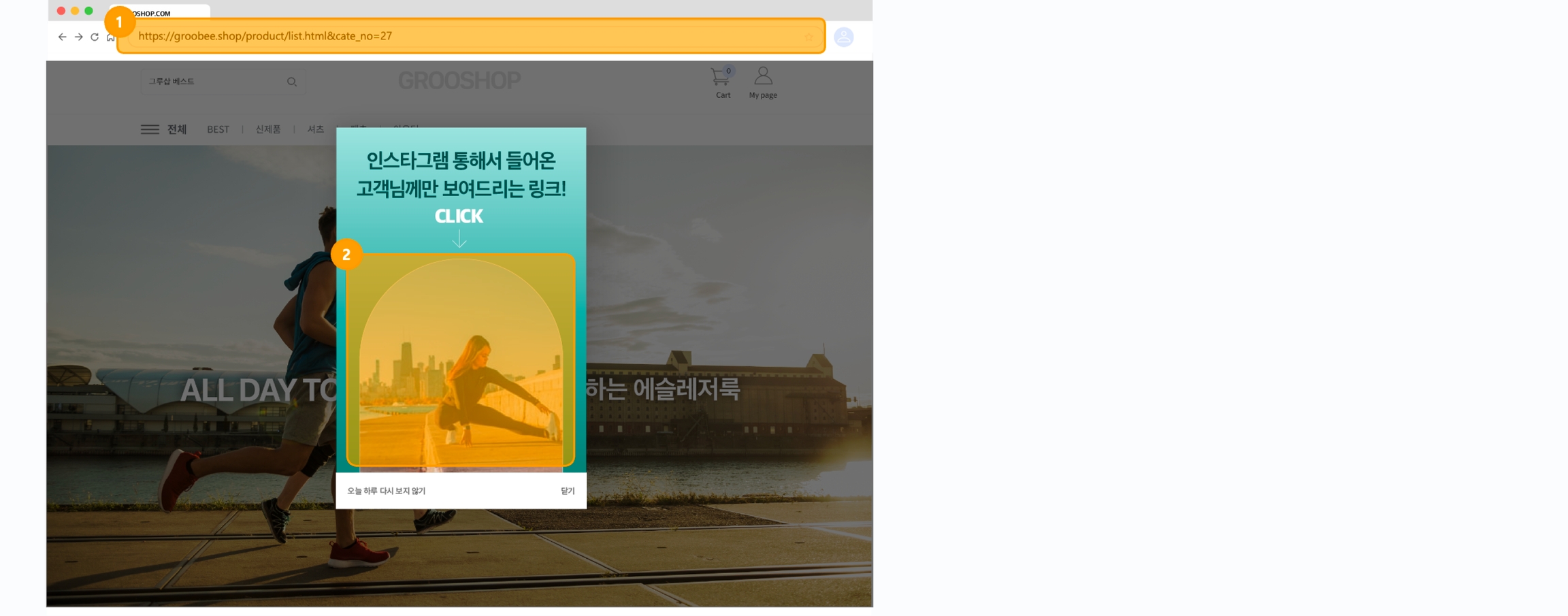 사이트에서 캠페인이 실행되고 노출 메시지에 설정한 링크를 클릭