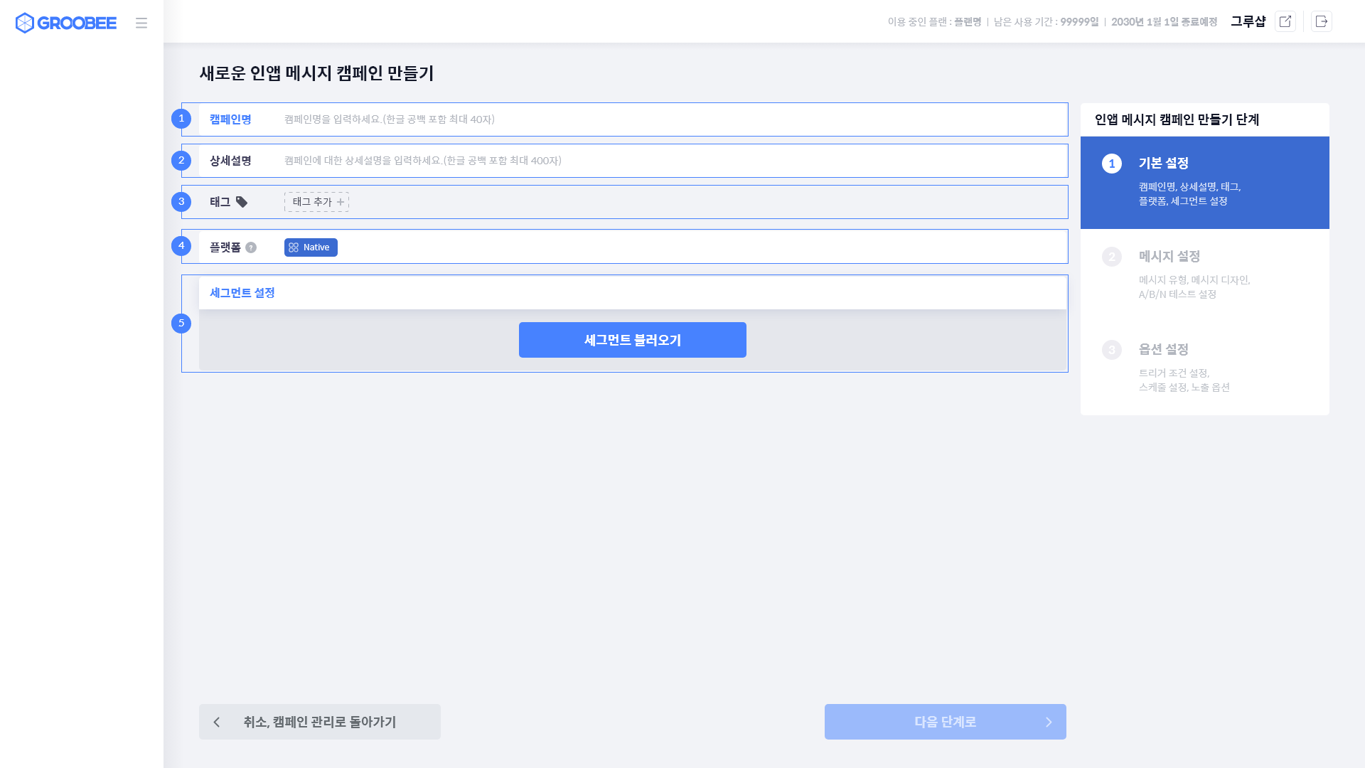 인앱 메시지 캠페인 1단계 기본 설정