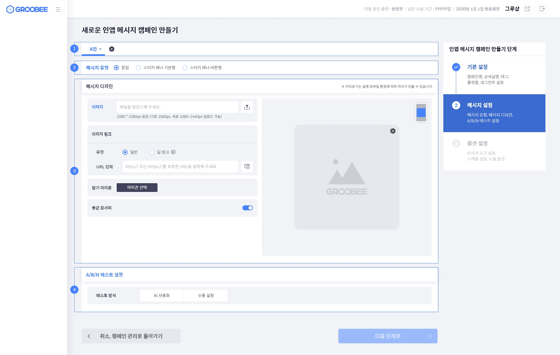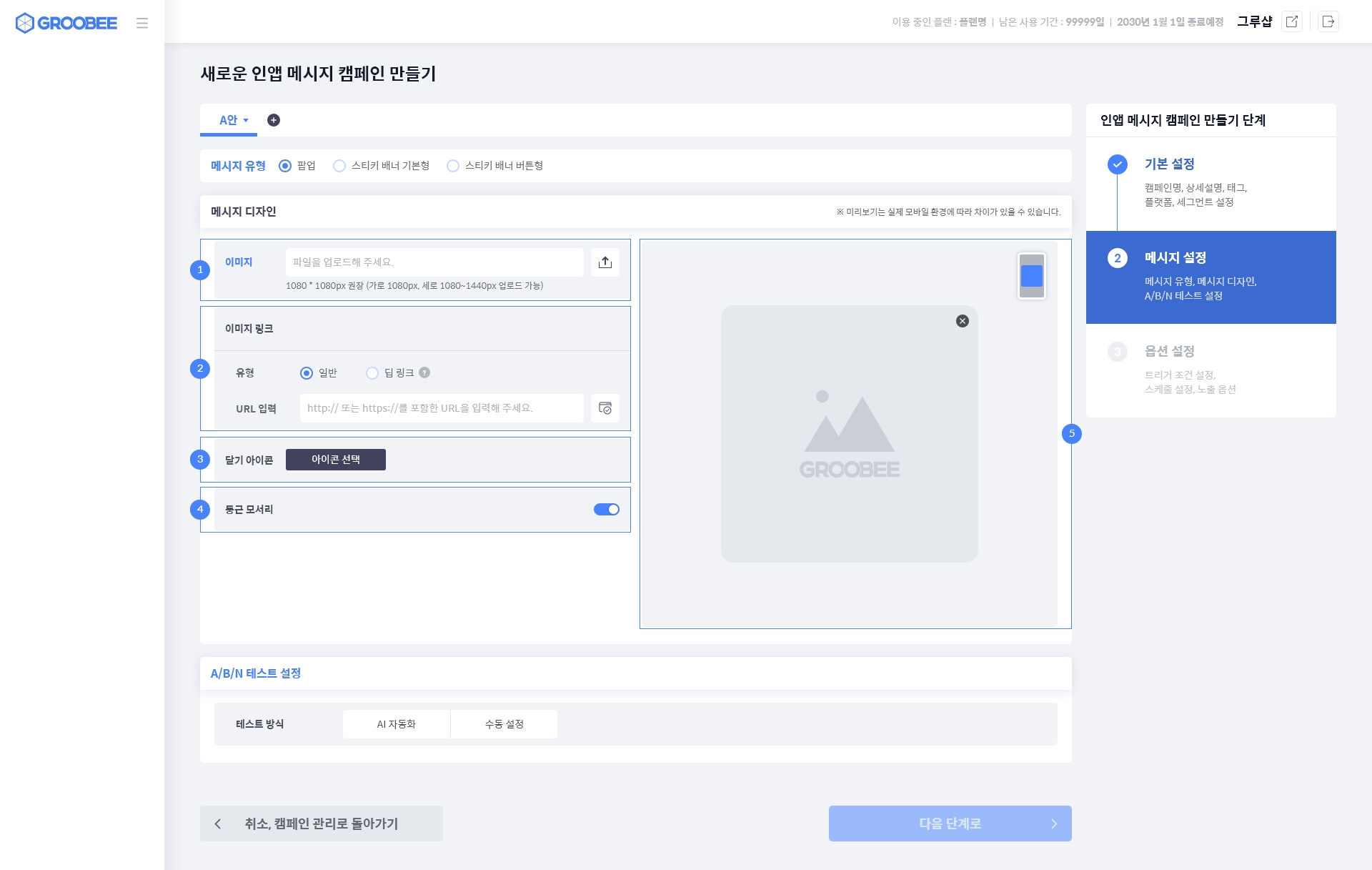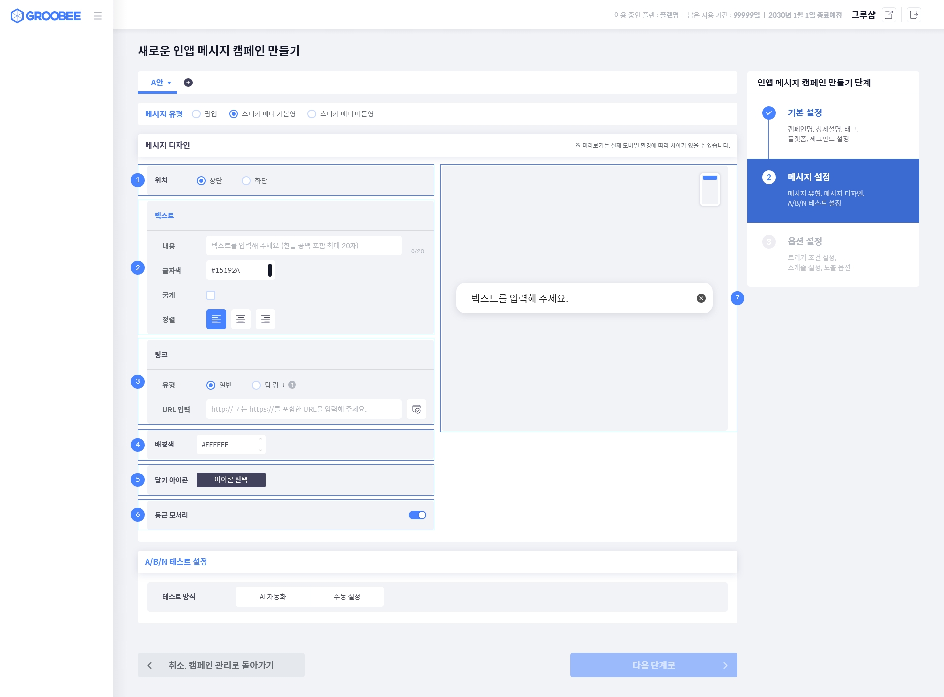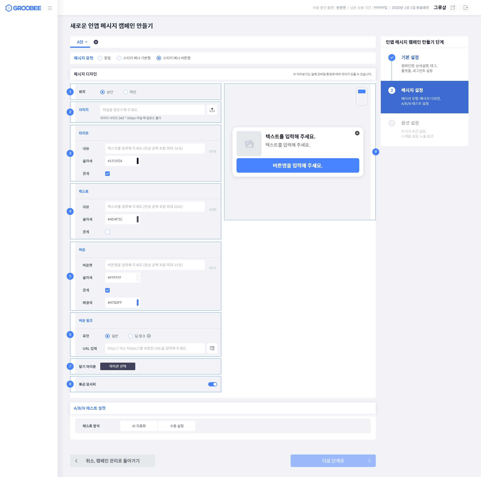 1. 메시지 디자인: 선택한 메시지 유형에 따라 콘텐츠를 작성할 수 있는 영역입니다.