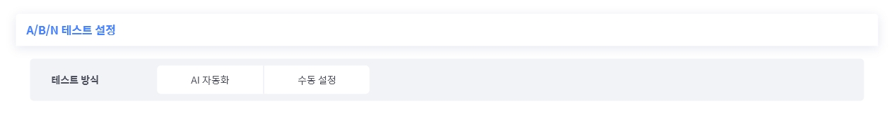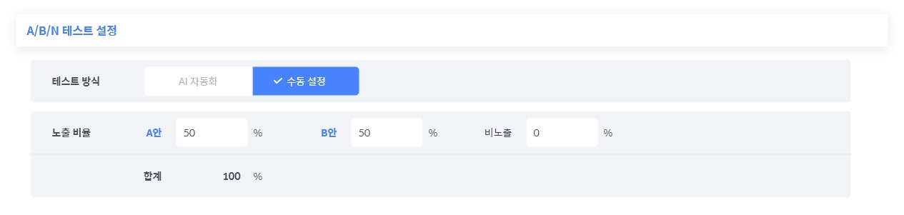 2. A/B/N 테스트 설정: 작성한 디자인 안들의 A/B/N 테스트 방식을 선택하고, 노출 비율을 정할 수 있습니다.