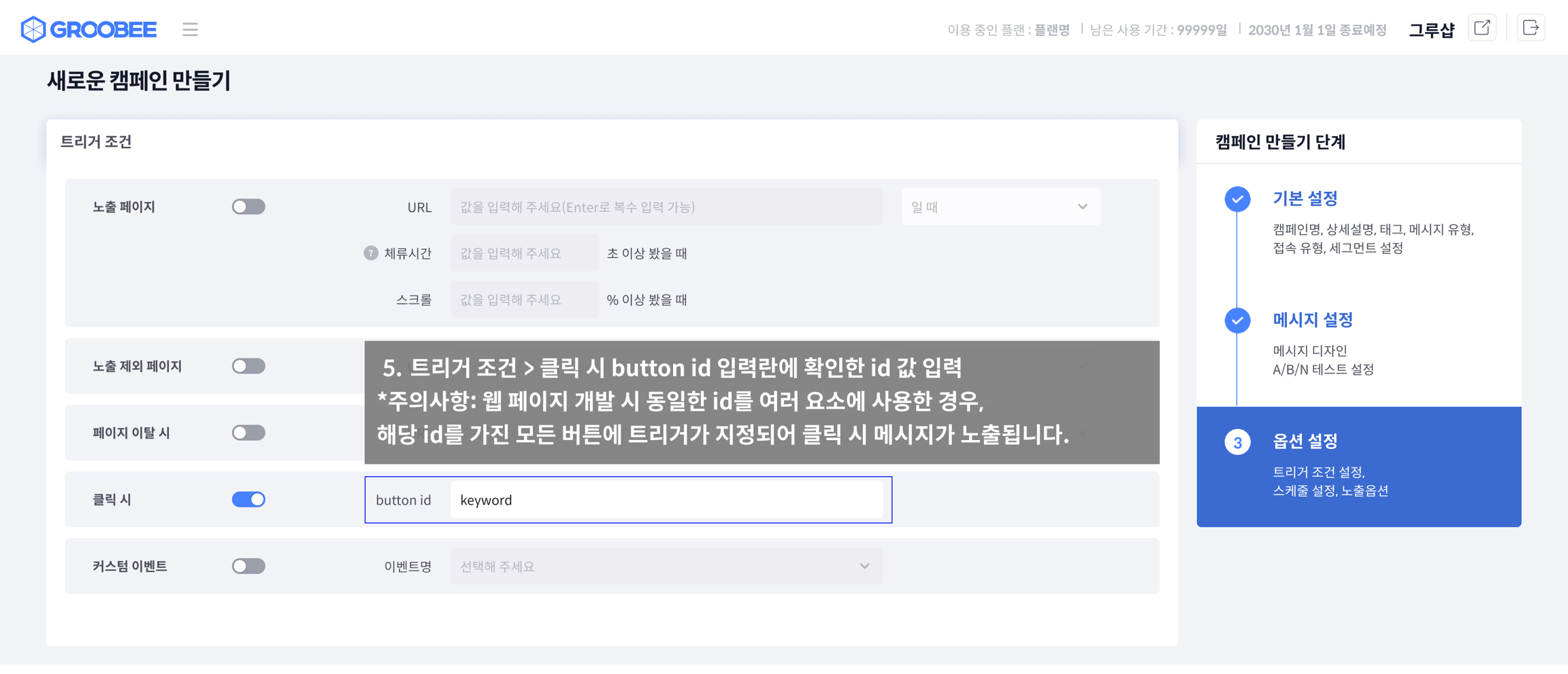 (단, 트리거 조건을 사용하면 우선순위와 관계없이 조건에 해당하면 노출되기 때문에 한 페이지 안에서 중복 노출될 수 있습니다. 중복 노출을 원하지 않는다면 캠페인 간 노출 조건이 겹치지 않도록 유의해 주세요)
