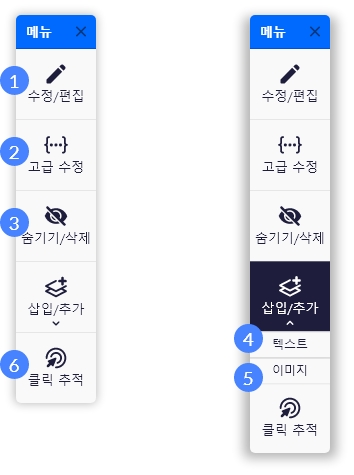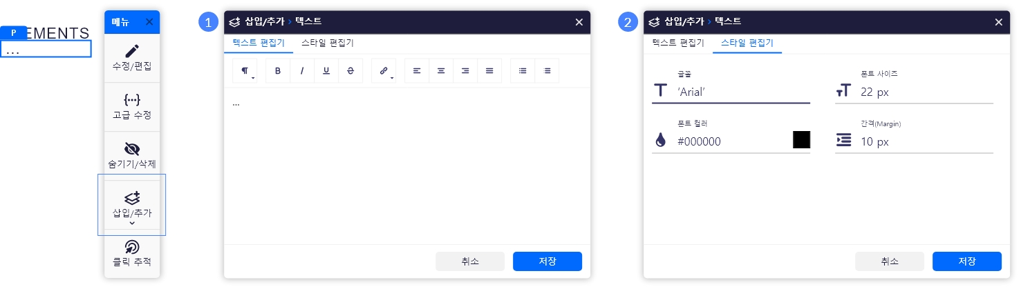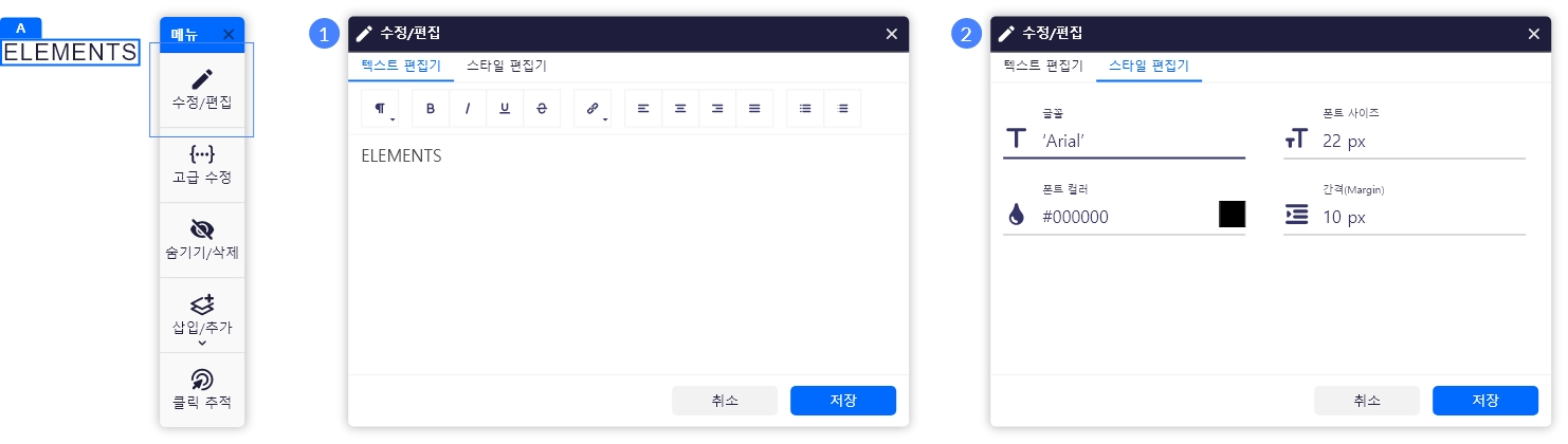 텍스트(HTML) 요소를 선택한 후 수정/편집 선택 시 텍스트와 스타일 편집이 가능합니다.