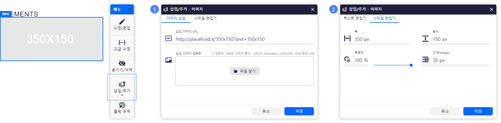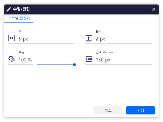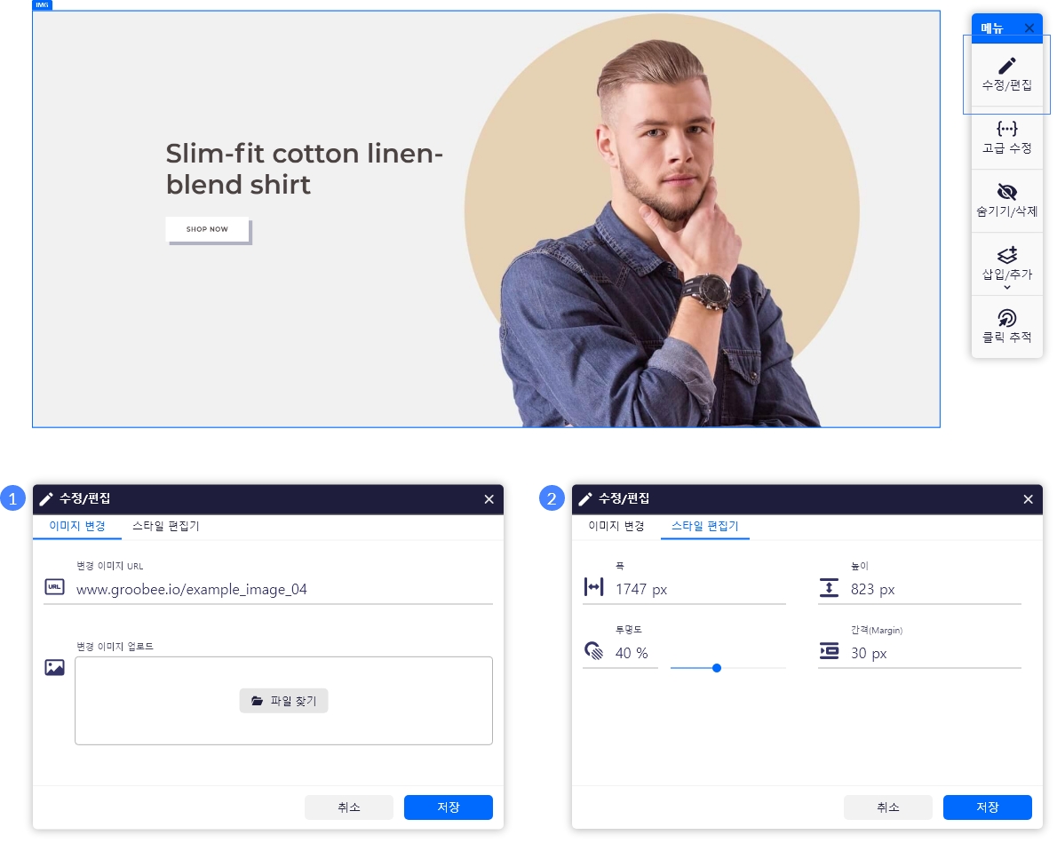 2. 수정/편집 > 스타일 편집기: 이미지 폭, 높이, 투명도, 간격(Margin) 수정이 가능합니다.