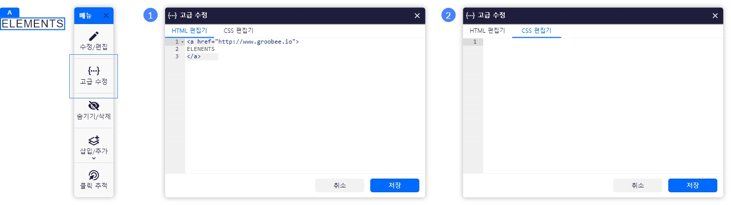 1. 고급수정 > HTML 편집기: 구성 요소의 HTML을 직접 편집할 수 있습니다.