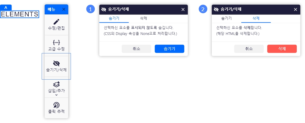 2. 숨기기/삭제 > 삭제: 선택한 구성 요소를 삭제합니다. 구성 요소의 형태(영역)까지 삭제됩니다.