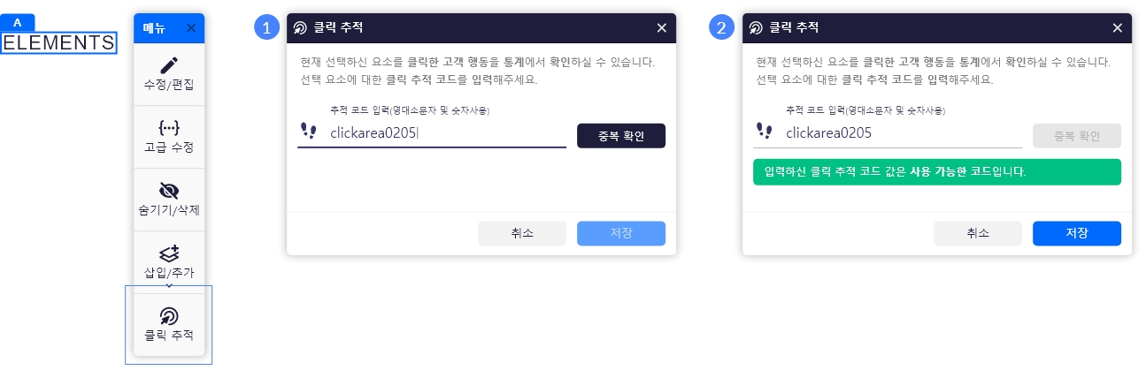 1. 해당 구성 요소의 클릭을 추적하려면 고유의 추적 코드(ID) 값을 입력해야 합니다. (중복확인 필수, 영대소문자 및 숫자 사용)