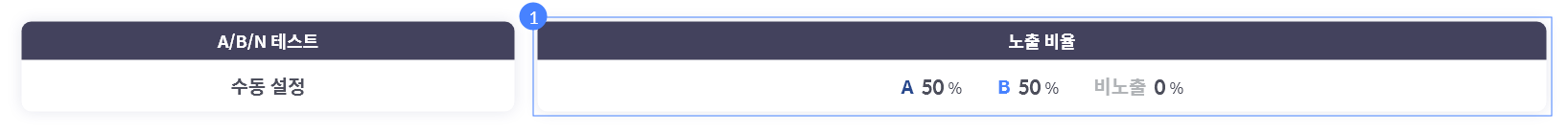 (1) 노출 비율 자동화 목표 : 캠페인 생성 시 설정했던 목표를 표시합니다. 이 목표가 각 디자인 안들의 성과 비교를 위한 기준이 되어 노출 비율 자동화가 진행됩니다. (2) 분석 결과 : A/B/N 테스트에서 AI가 가장 성과가 좋았다고 판단한 디자인 안을 표시합니다. 2) 테스트 방식 : 수동 설정