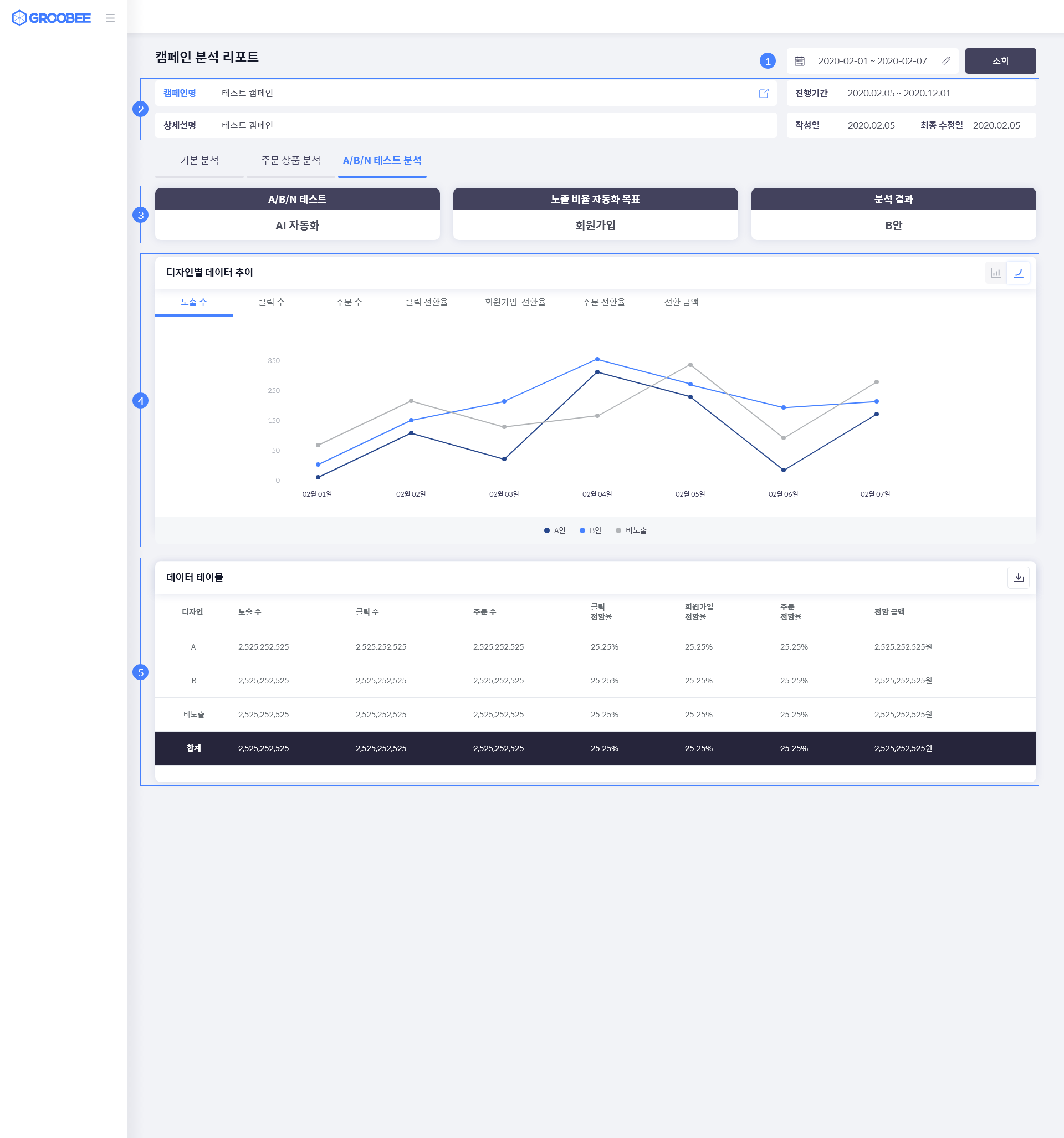기간 설정: 캠페인의 진행 기간을 참고하여 데이터 조회 기간을 입력해주세요. A/B/N 테스트 결과, 디자인별 데이터 추이, 데이터 테이블에 공통적으로 적용되는 조회 기간입니다.