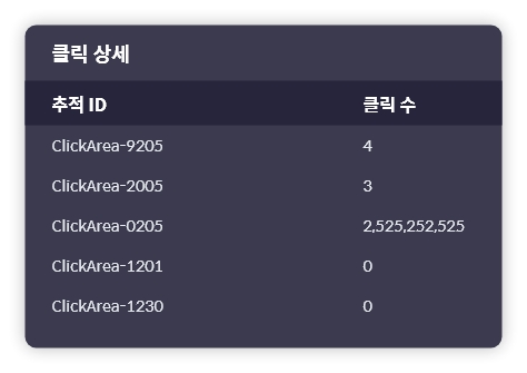 클릭 수 컬럼의 데이터에 마우스 오버 시 캠페인 생성 시 설정한 클릭 추적 ID의 개별 클릭 수를 확인할 수 있습니다.