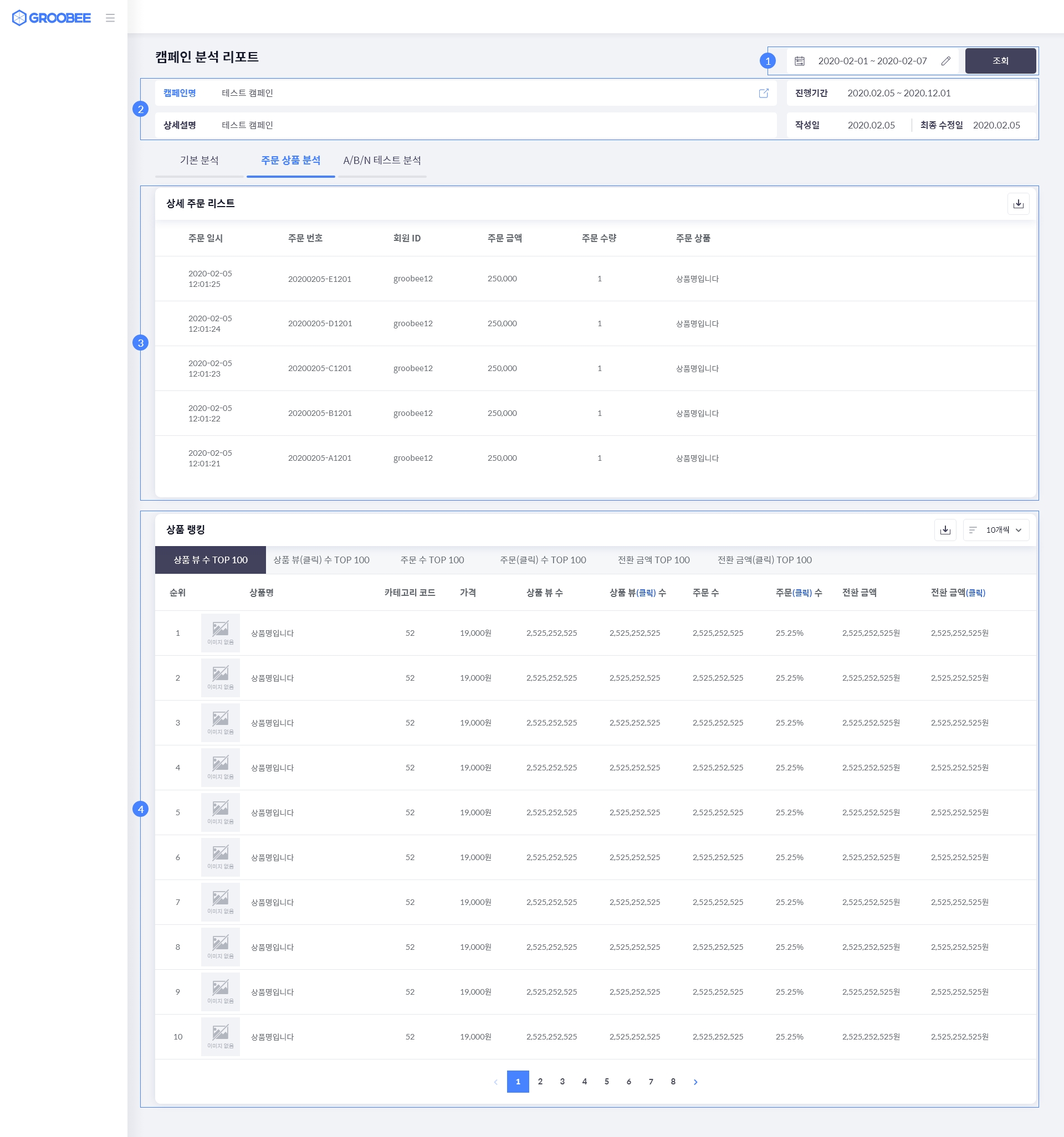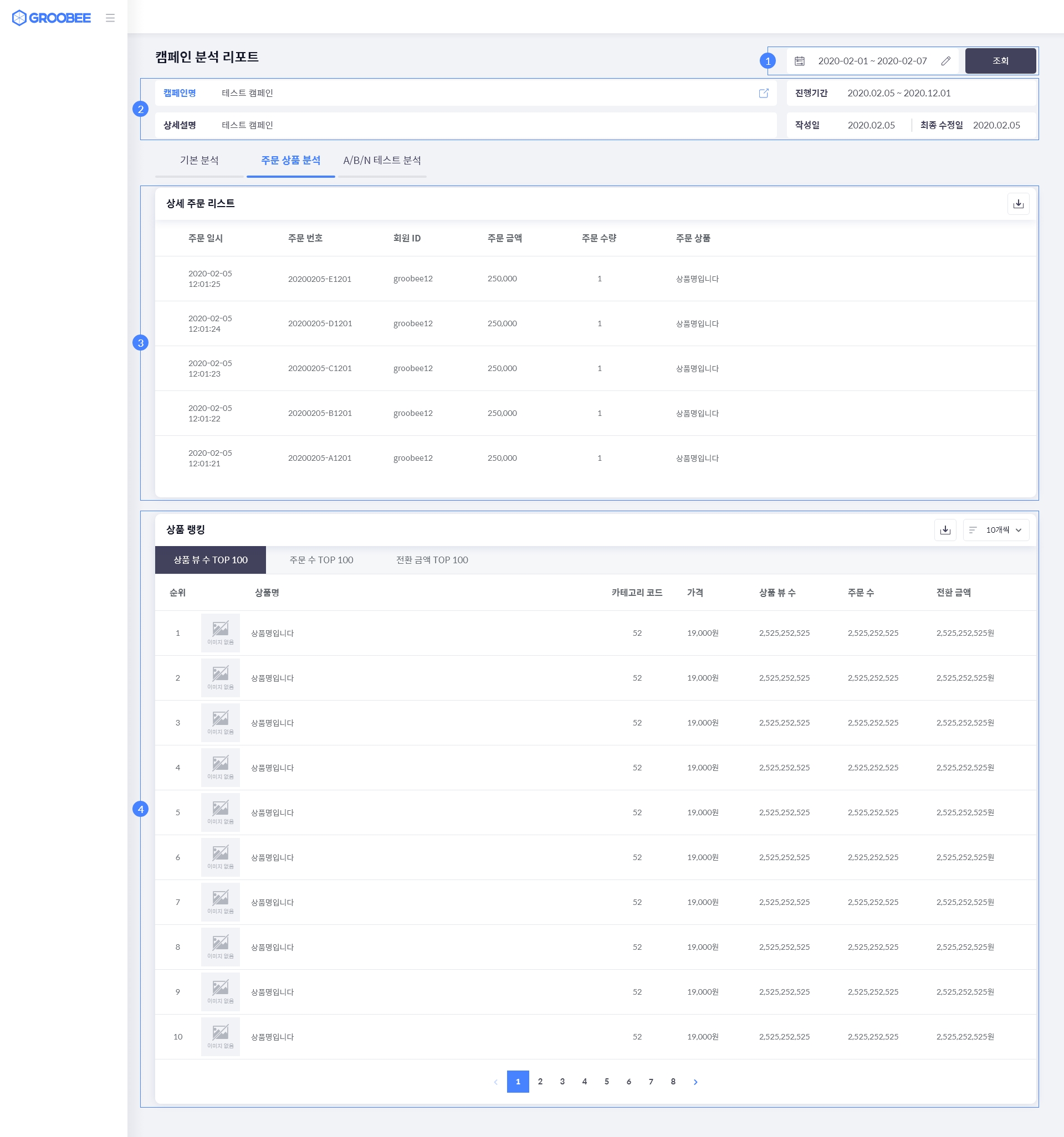 캠페인 분석 리포트의 주문 상품 분석을 통해 선택한 캠페인을 통한 주문 이력과 상품 랭킹을 확인할 수 있습니다.