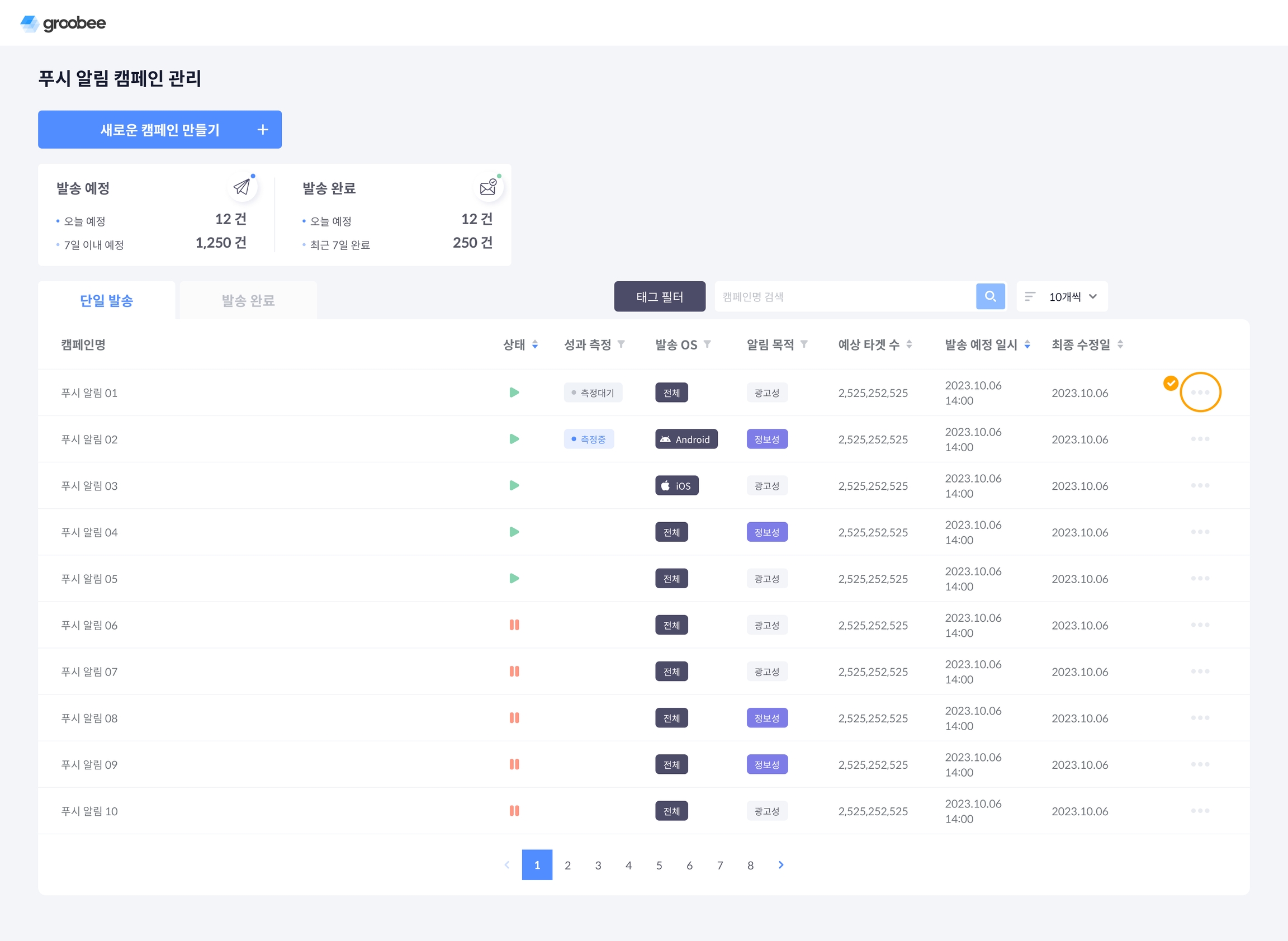 발송 완료 : 발송 완료된 모든 푸시 알림 캠페인 리스트를 확인할 수 있습니다.