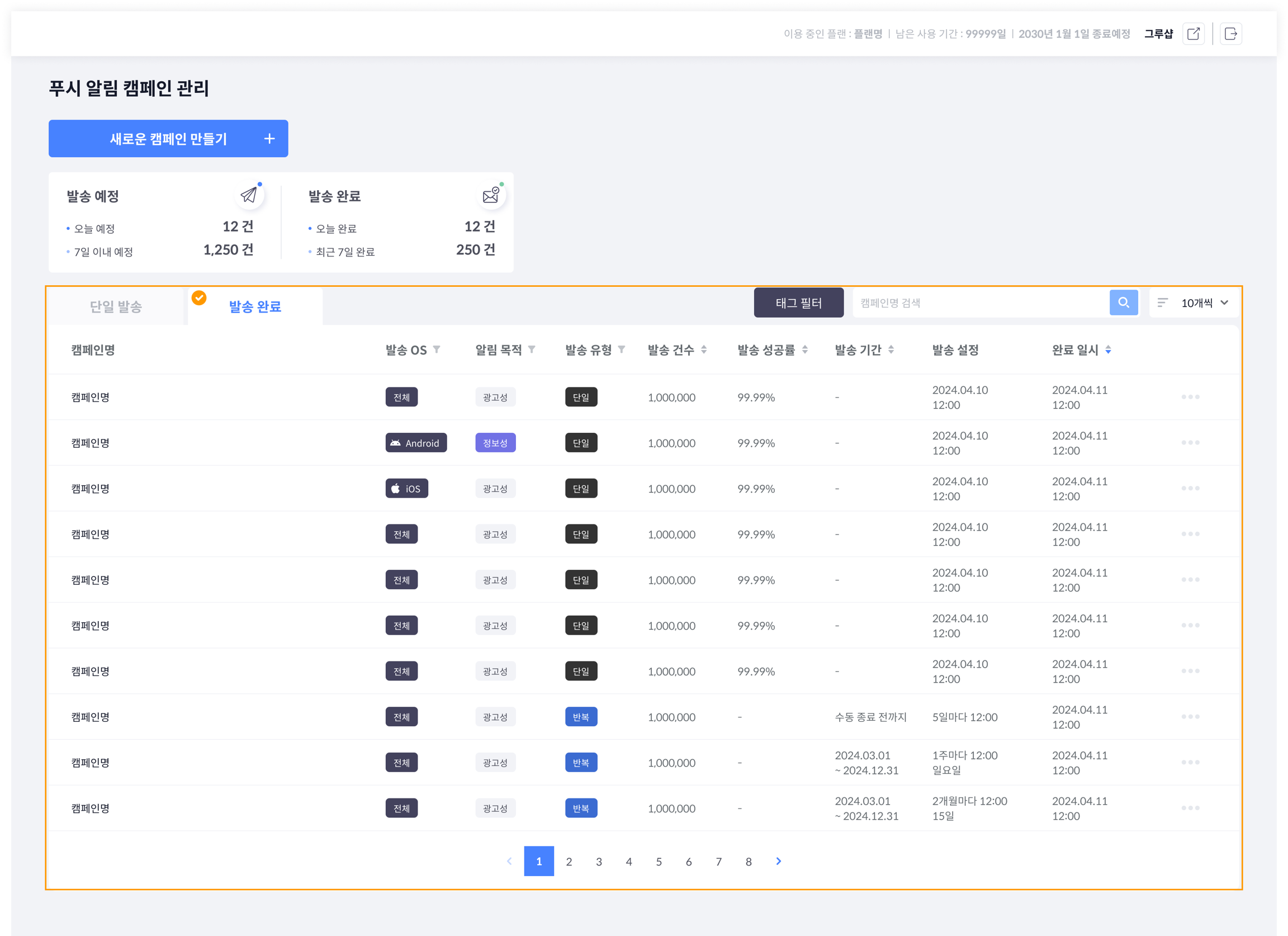 푸시 알림 발송 유형별(단일 발송, 발송 완료) 캠페인 리스트, 발송 예정, 발송 완료, 당월 사용료를 확인할 수 있습니다.