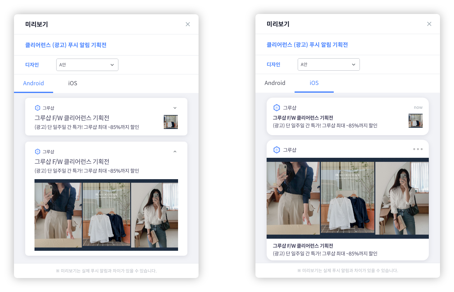 선택된 푸시 알림을 미리보기 할 수 있습니다. 메시지 설정에서 작성한 기본 메시지, 펼친 메시지를 미리보기 할 수 있습니다.
