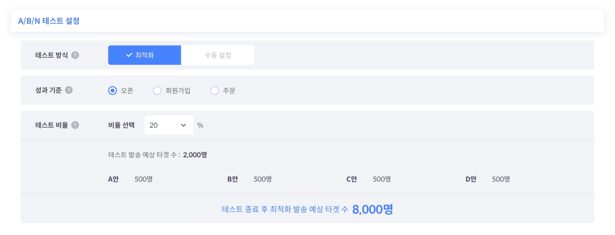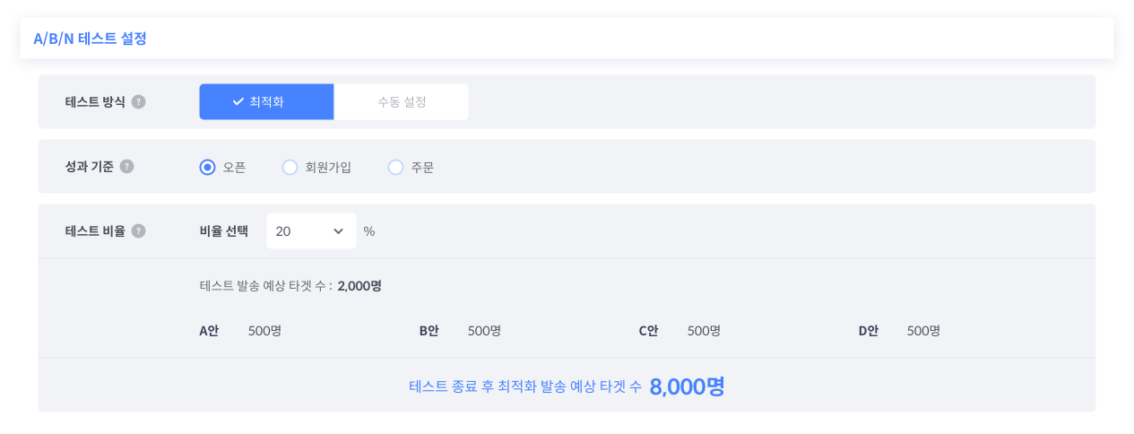 테스트 방식 '최적화'를 선택하면 일부 고객을 대상으로 푸시 알림을 발송하여 A/B/N 테스트를 진행한 후, 가장 성과가 좋은 디자인 안을 나머지 고객에게 자동으로 발송합니다. 예를 들어 10,000명의 고객에게 푸시 알림 발송 시 테스트 비율을 20%로 설정 했다면, 2,000명을 대상으로 A/B/N 테스트를 실시하여 가장 성과가 좋은 디자인 안을 나머지 8,000명의 고객에게 발송합니다.