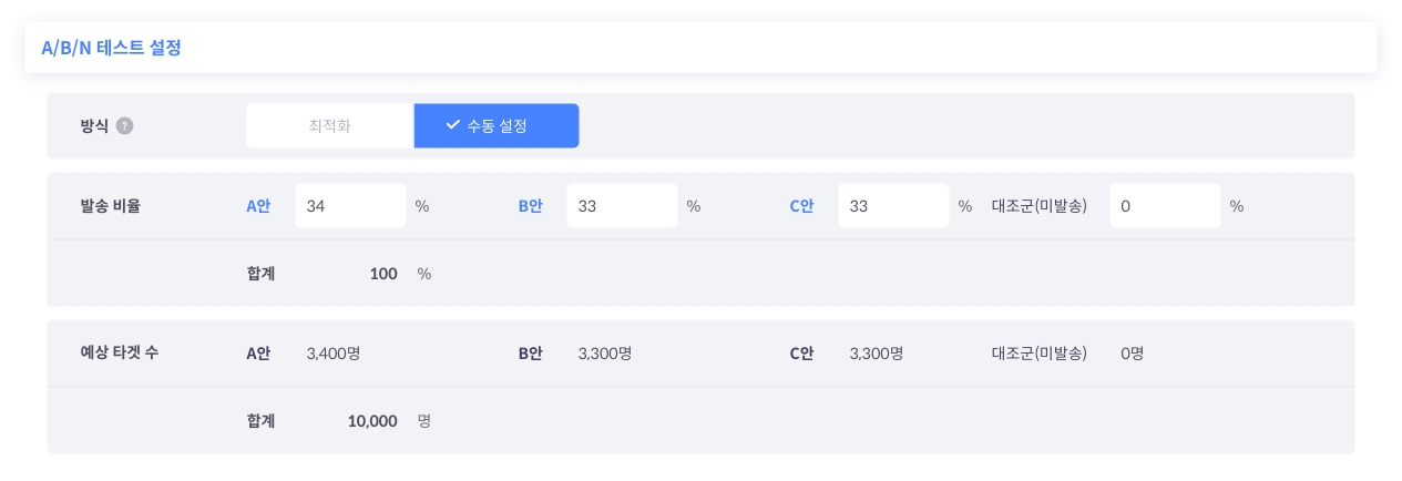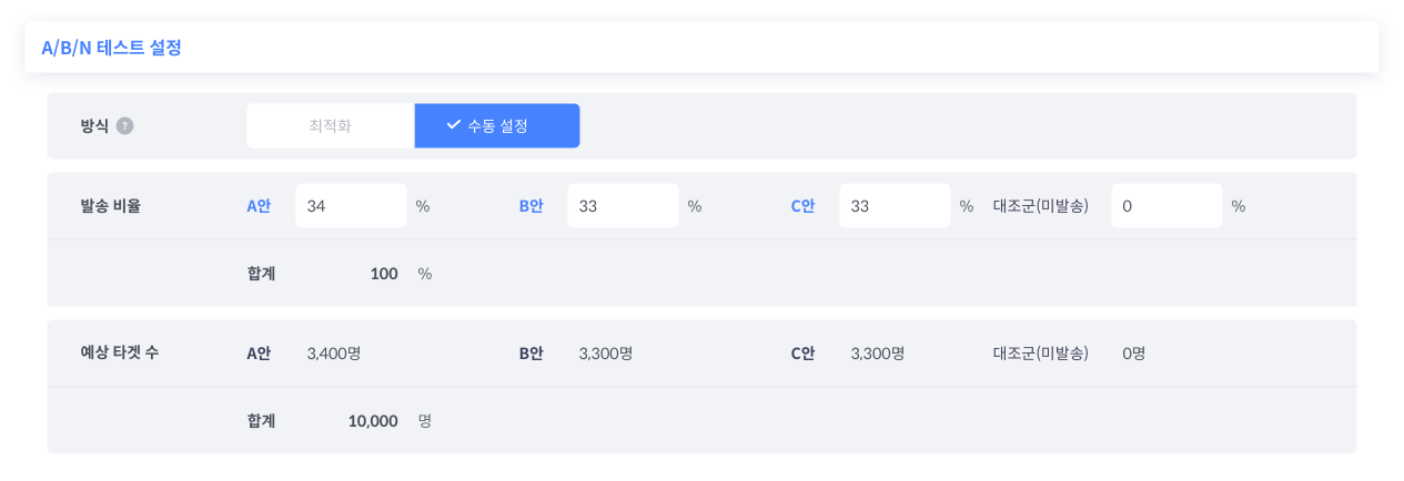발송 비율을 설정할 때, 대조군(미발송) 비율을 포함한 전체 발송 비율의 합은 총 100%가 되어야 합니다.