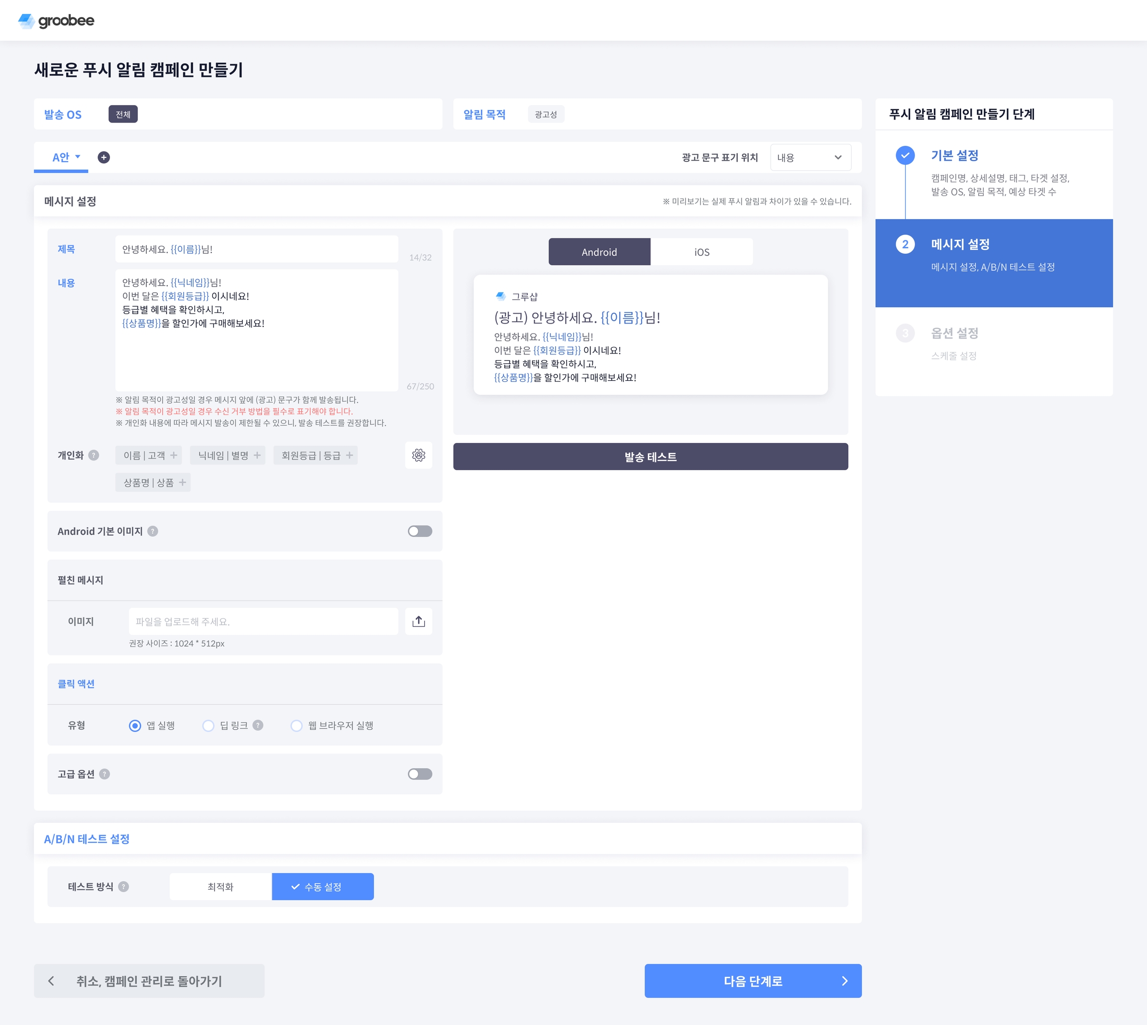 푸시 알림 캠페인 2단계 메시지 설정 1) 공통사항