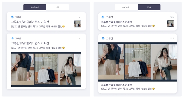 발송 OS별 미리보기: Android, iOS 탭을 클릭하여 메시지 작성 시 실시간으로 미리보기 할 수 있습니다.