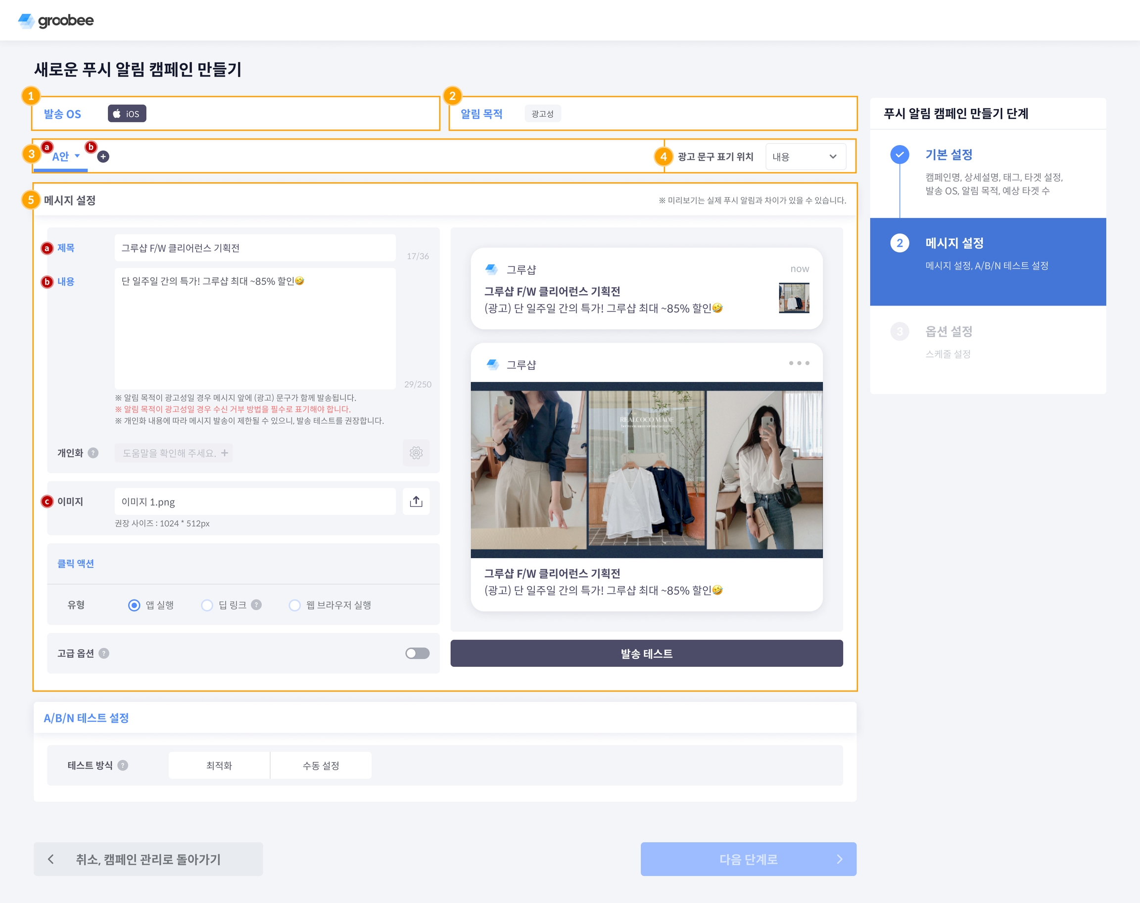 푸시 알림 캠페인 2단계 메시지 설정 4) 발송 OS : iOS