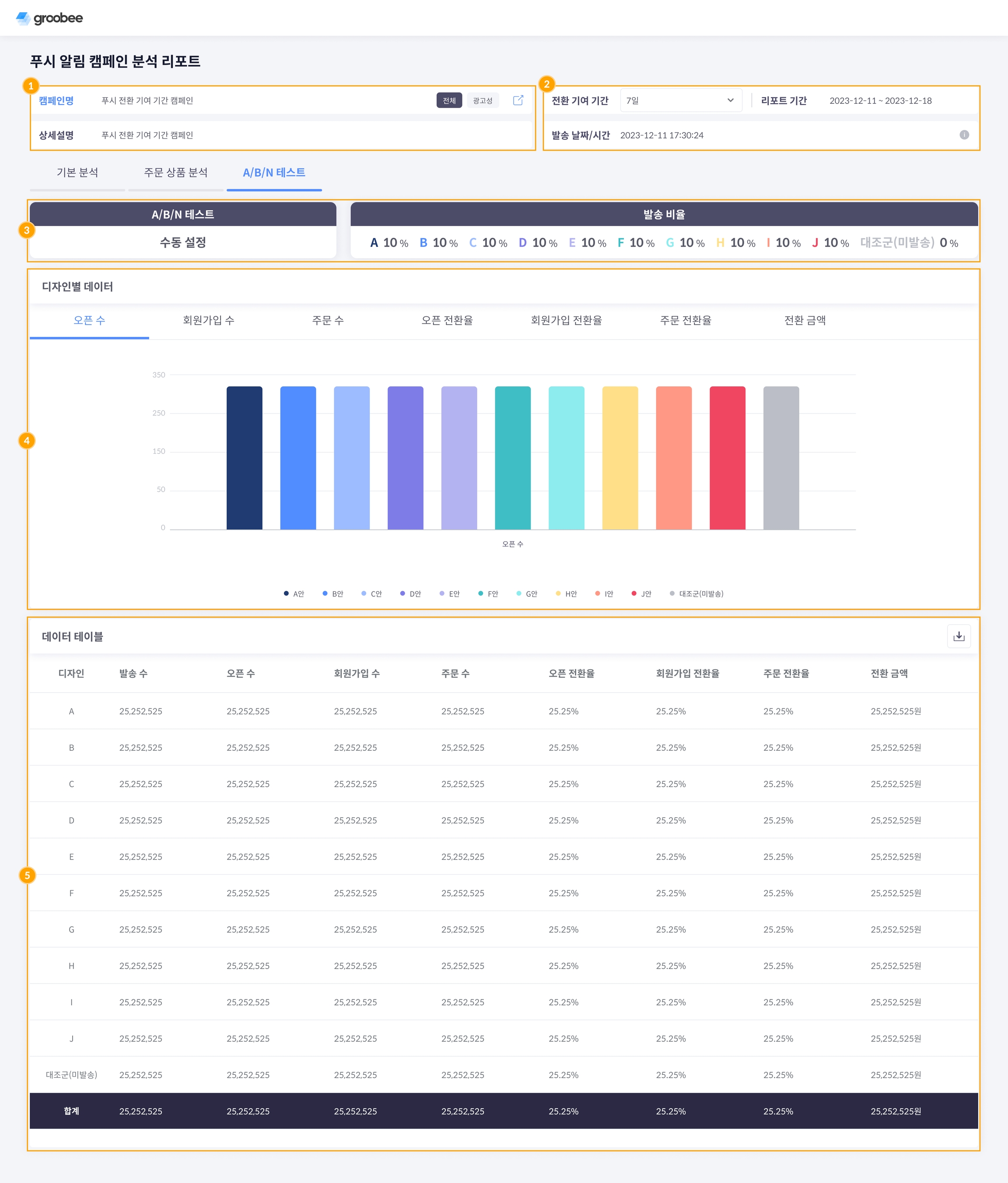 캠페인 분석 리포트의 A/B/N 테스트 분석을 통해 선택한 캠페인의 A/B/N 테스트 결과와 디자인별 성과를 확인할 수 있습니다.