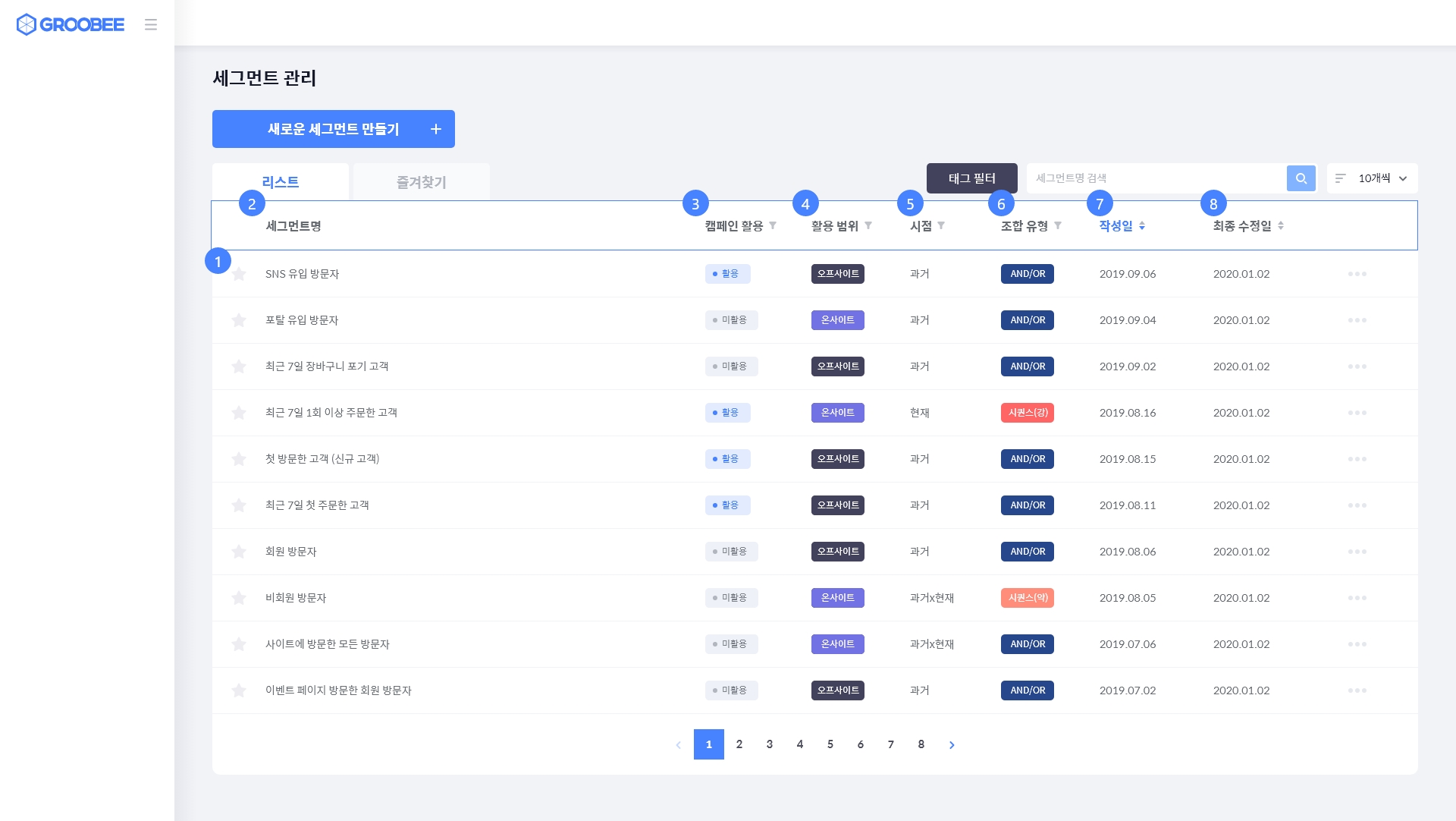 세그먼트 생성 시 설정한 시점을 표시 합니다. 항목명 클릭 시 필터 기능을 사용할 수 있습니다.