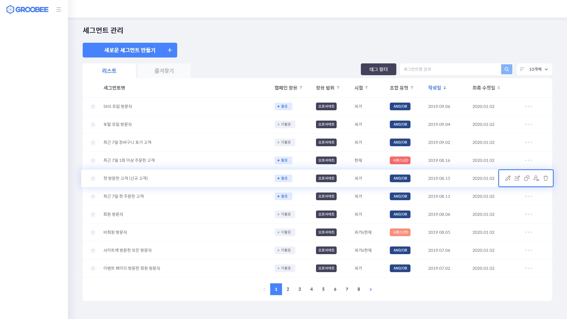세그먼트 관리 페이지에서는 새로운 세그먼트를 만들고 생성한 세그먼트를 관리할 수 있습니다.