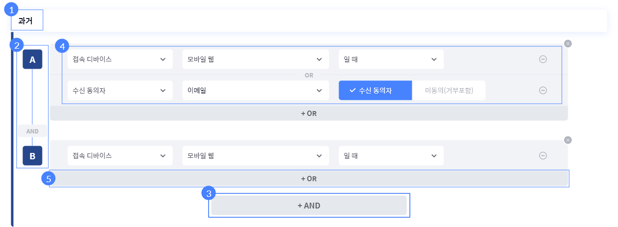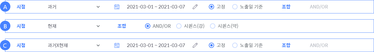 과거와 현재는 각각 하나의 그룹으로 구성되며, 두 시점은 AND 조건으로 연결됩니다. 각 시점 내부에서는 변수들을 AND 또는 OR 조건으로 설정할 수 있습니다.