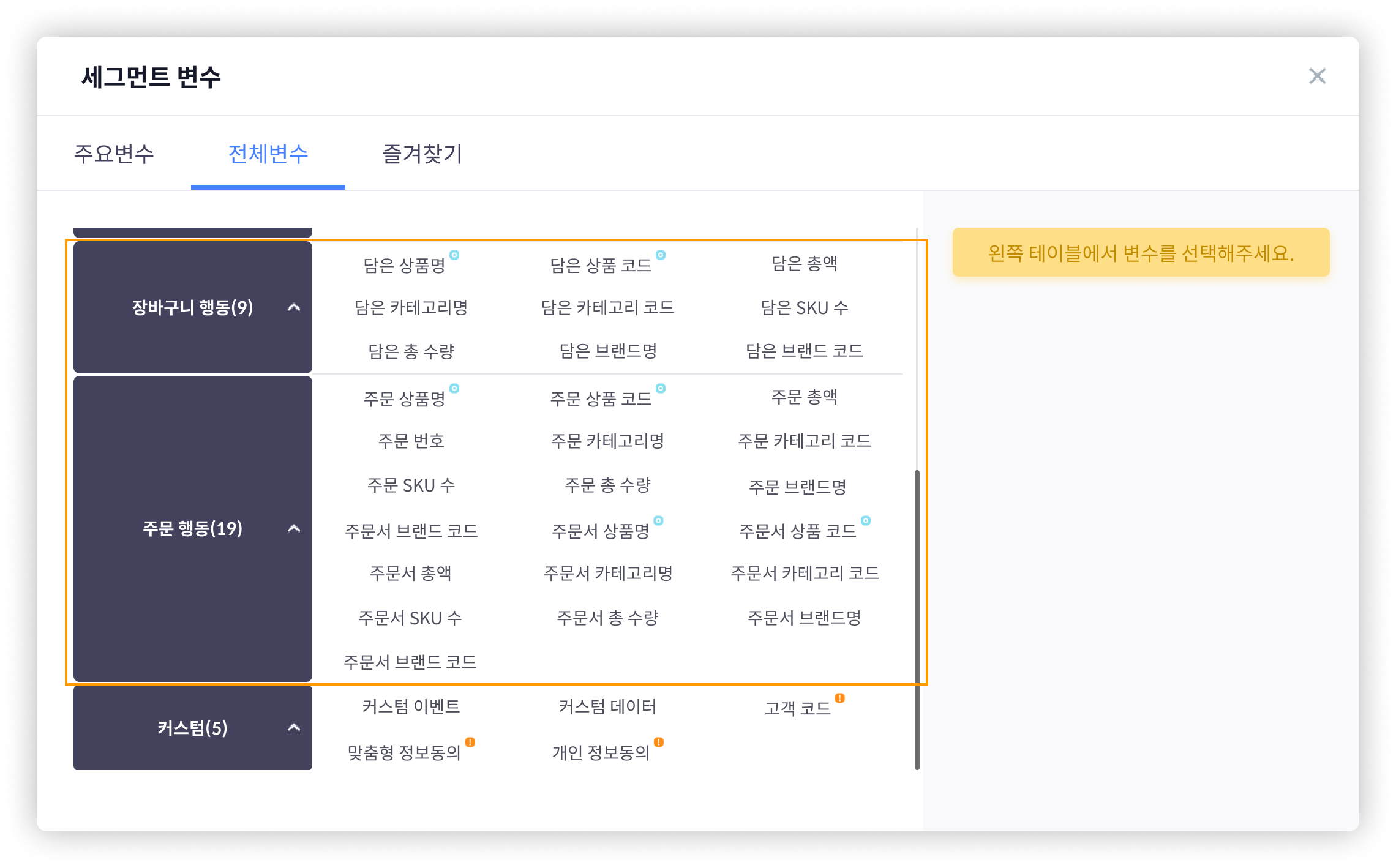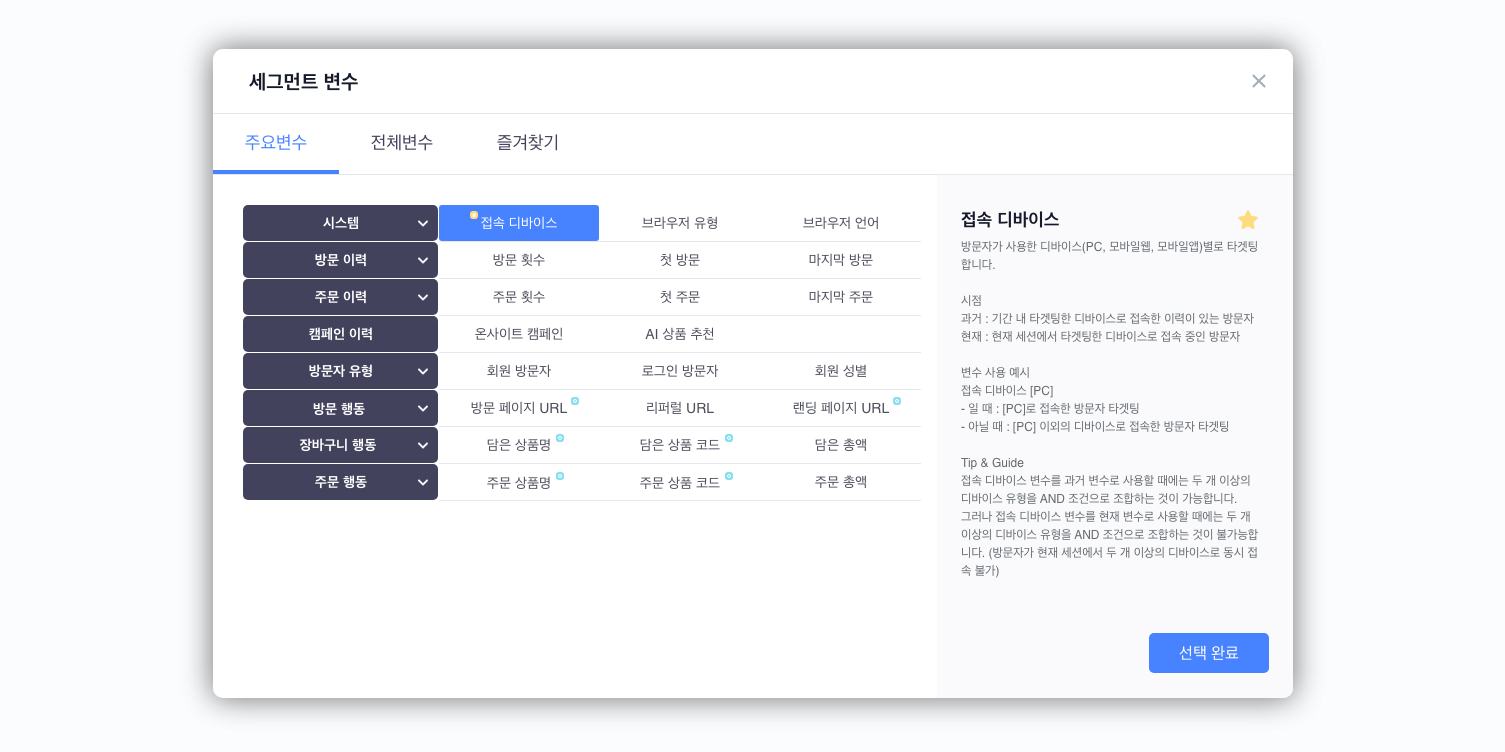 세그먼트 변수 클릭 시 각 변수에 대한 상세 설명을 확인할 수 있습니다.