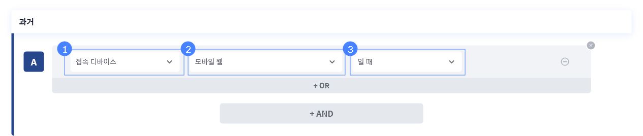 OR : 넓은 범위의 세그먼트 타겟팅을 위한 조합 유형입니다. OR 조합으로 묶인 변수 중 하나만 만족해도 타겟팅됩니다.