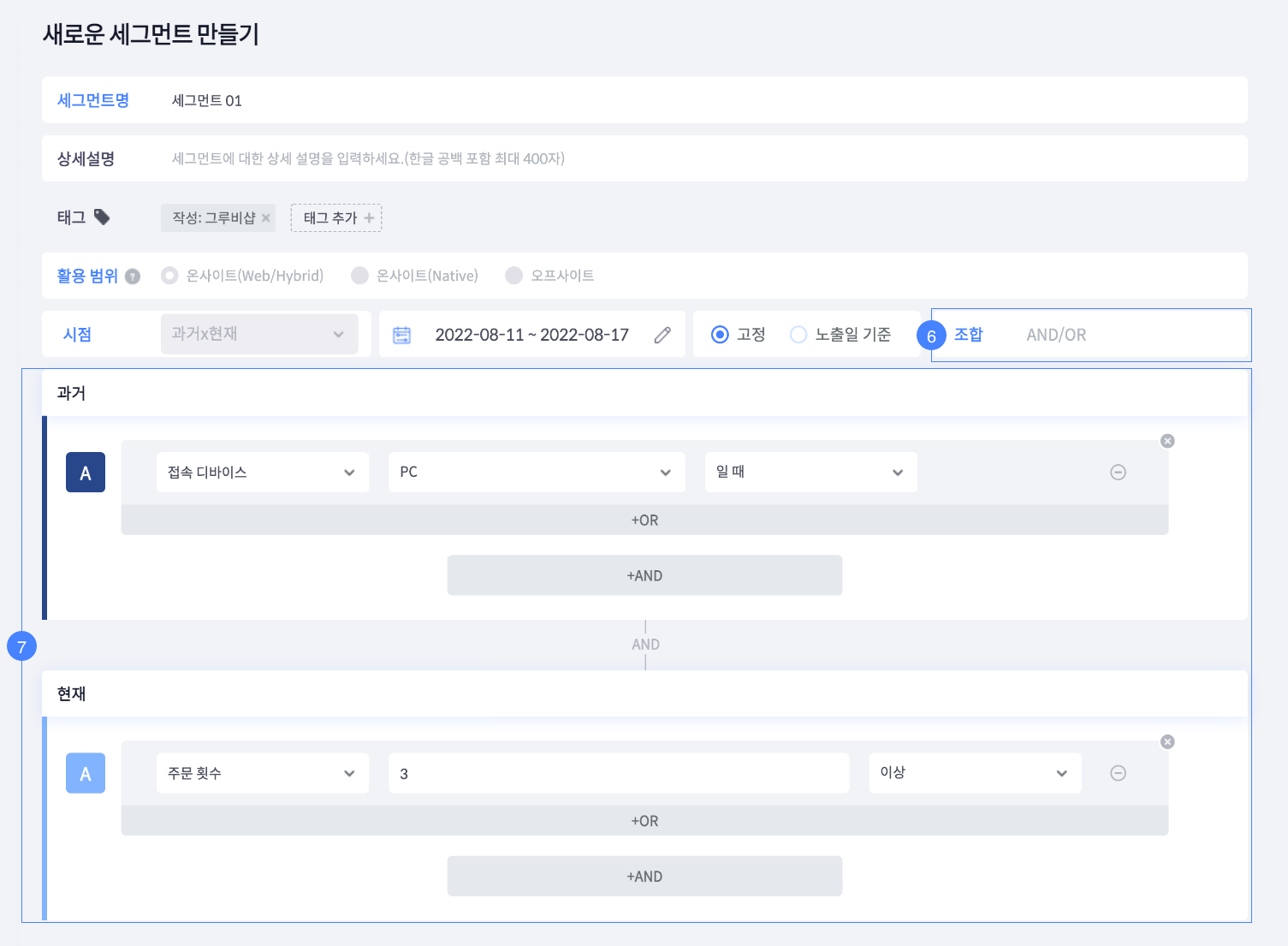 AND : 좁은 범위의 세밀한 세그먼트 타겟팅을 위한 조합 유형입니다. AND 조합으로 묶인 변수는 동시에 만족해야 합니다.