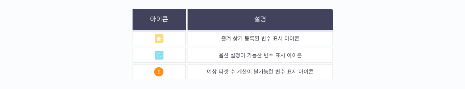 예상 타겟 수 계산이 불가능한 변수 표시 아이콘 : 예상 타겟 수 계산이 불가능한 변수입니다.