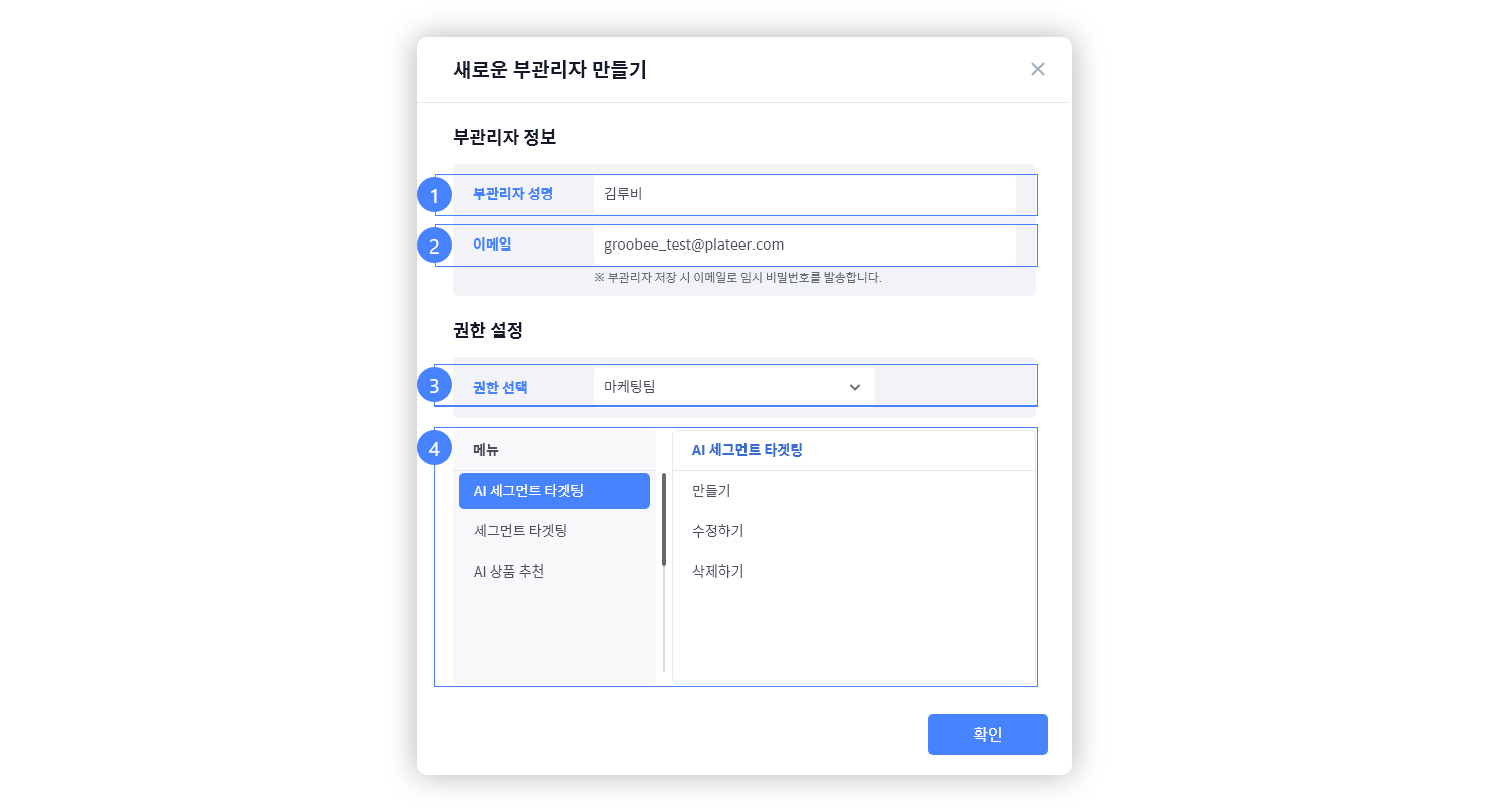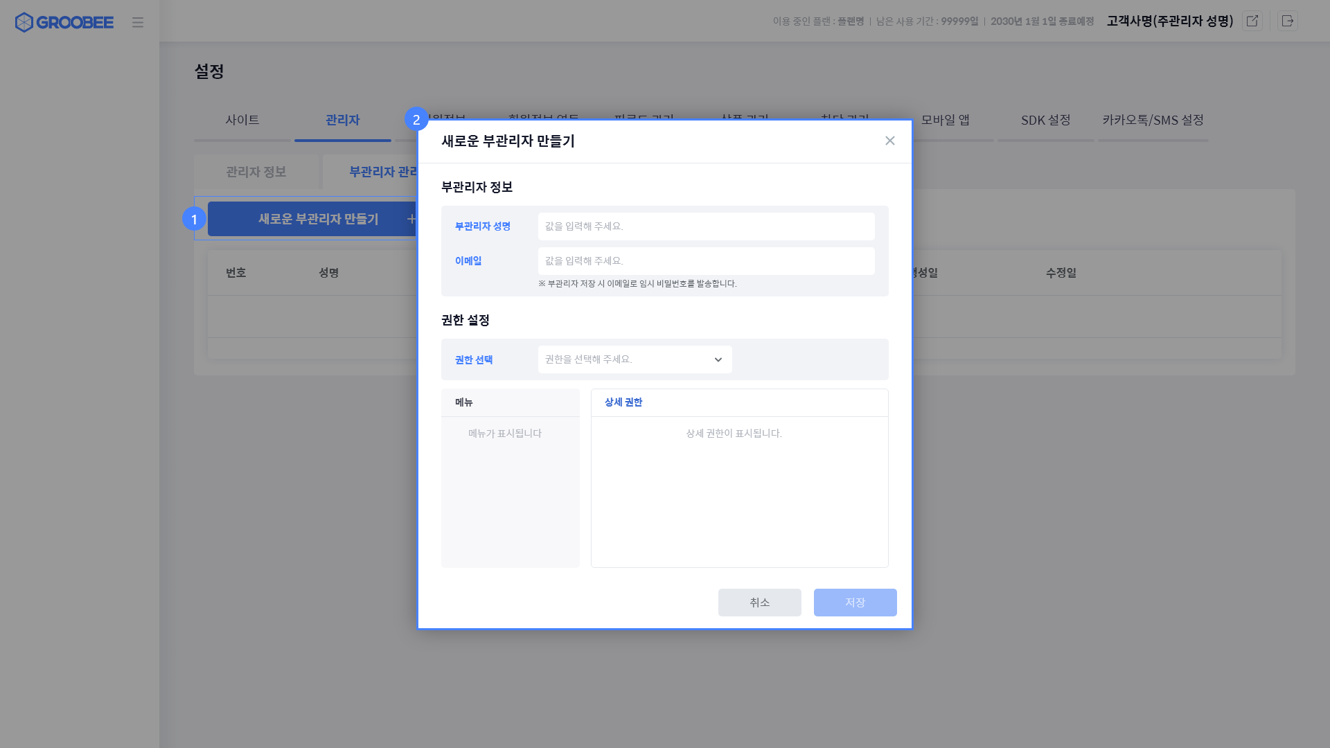새로운 부관리자 만들기에서 부관리자 정보와, 권한 설정을 합니다.