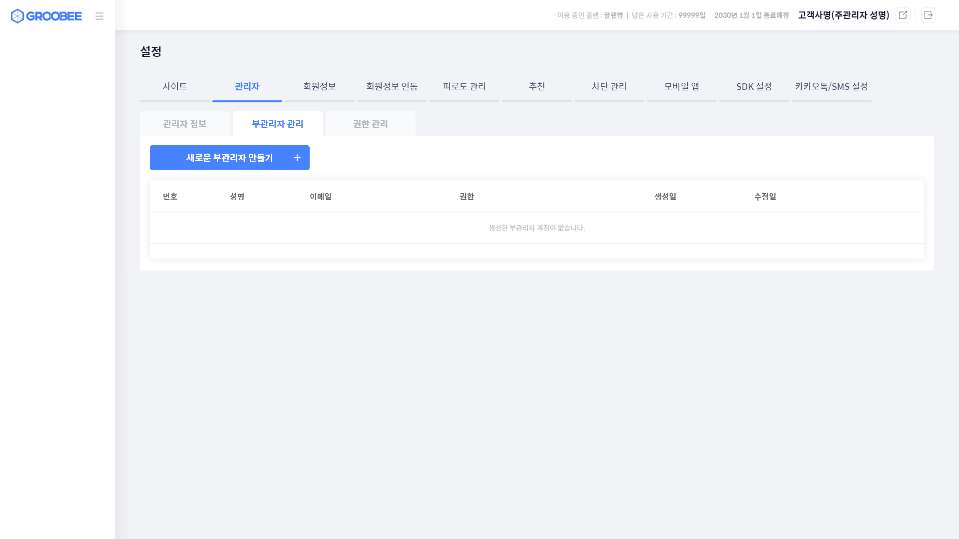 부관리자 관리 탭에서는 그루비를 여러 계정으로 관리하기 위해 계정을 생성하고 관리할 수 있습니다.