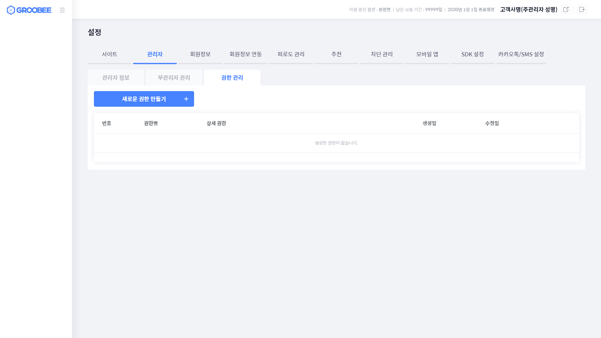 권한을 만들어 부관리자에게 권한을 부여할 수 있습니다.