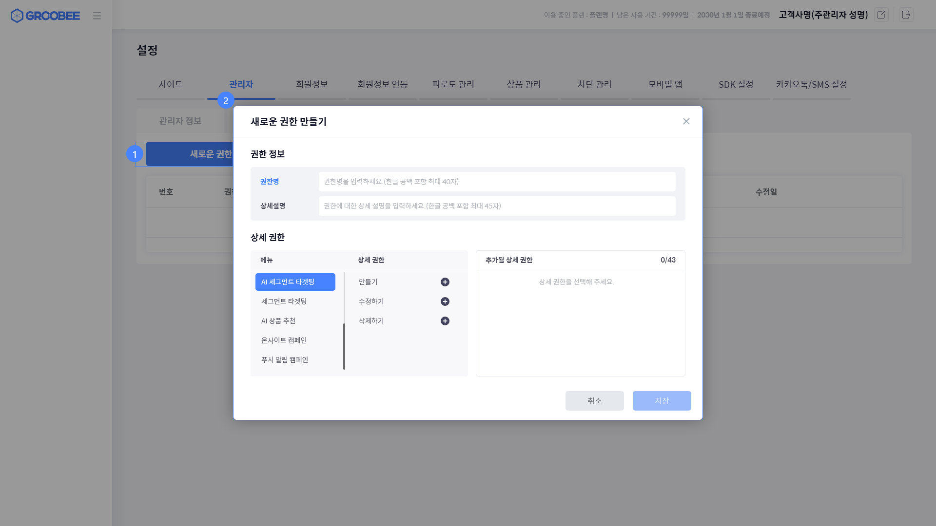 권한 관리 탭에서는 여러 권한을 만들고 생성한 권한을 관리할 수 있습니다.