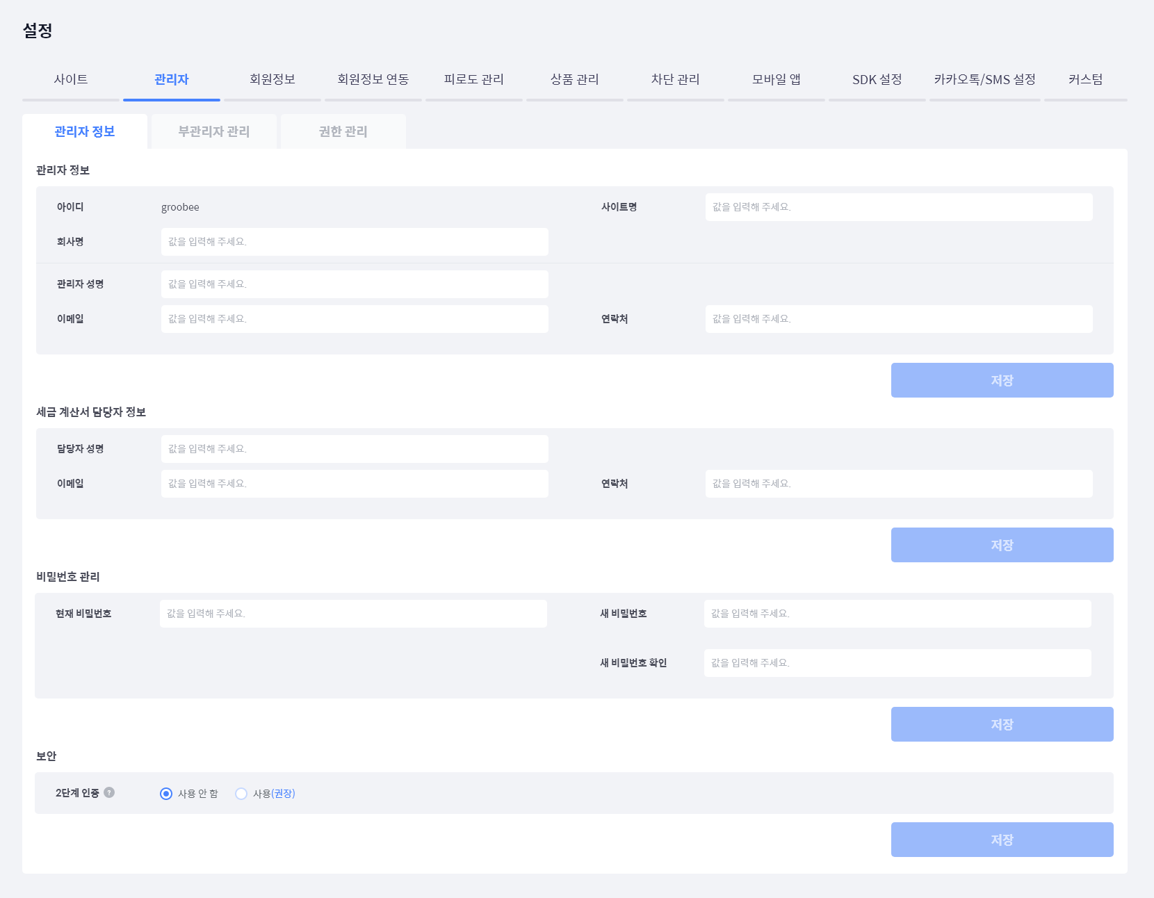 관리자 정보 탭 에서는 관리자 정보, 세금계산서 담당자 정보, 비밀번호 관리, 보안 설정을 할 수 있습니다.