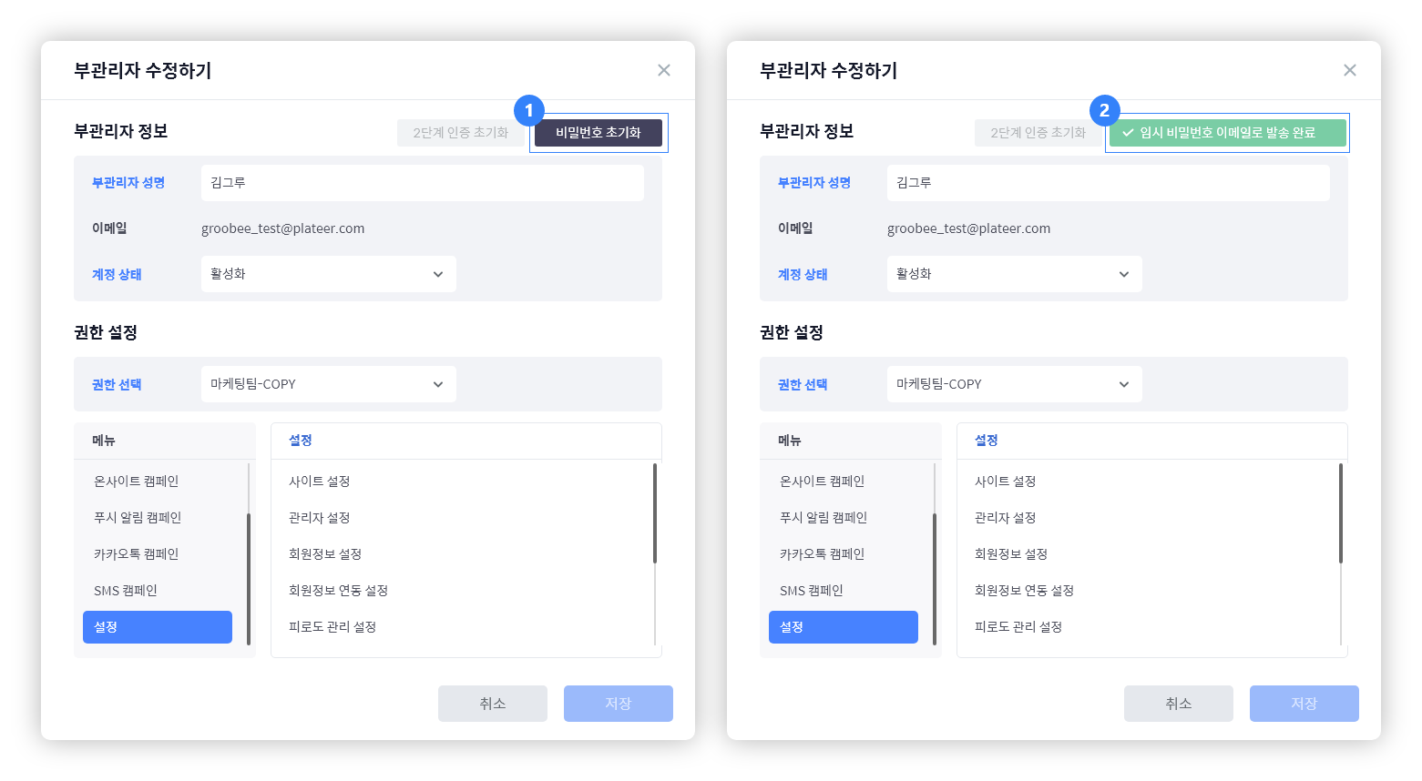 부관리자 계정 비밀번호 분실 시 '부관리자 수정하기 > 비밀번호 초기화'를 통해 계정 이메일 임시 비밀번호를 발급할 수 있습니다.