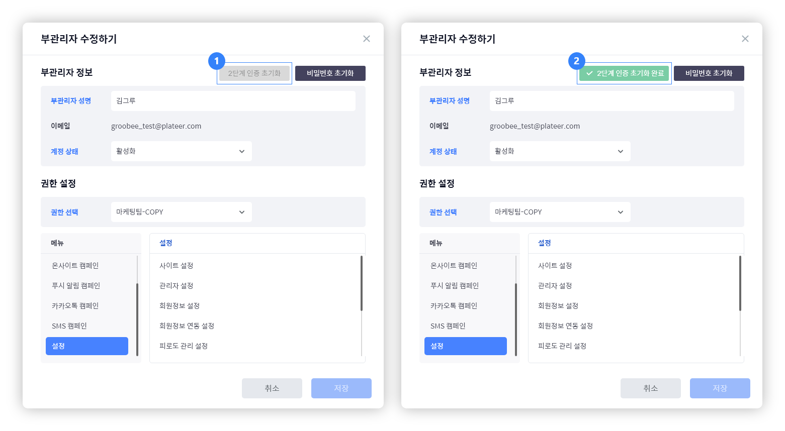 2단계 인증에 문제가 있는 부관리자 계정은 주관리자에게 요청하여 '부관리자 수정하기 > 2단계 인증 초기화'를 통해 2단계 인증을 다시 설정할 수 있습니다.