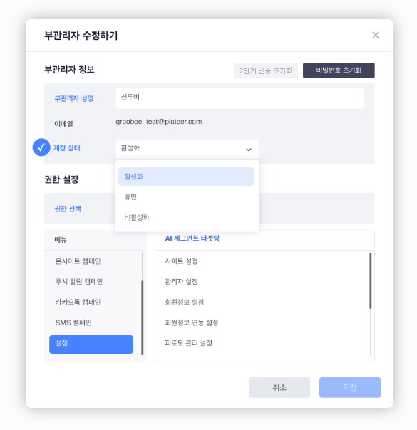 부관리자 계정 상태는 총 3가지로 설정할 수 있습니다.