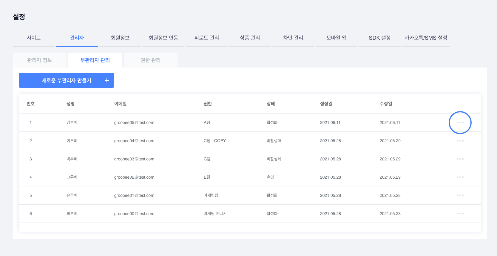 부관리자를 생성하려면 설정 > 관리자 탭 > 부관리자 관리 탭으로 이동하여 '새운 부관리자 만들기'를 진행합니다