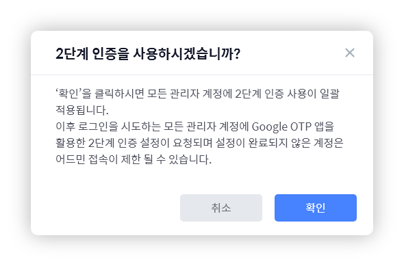 이후 나타나는 창에서 '확인' 버튼을 클릭합니다. (클릭 시 모든 관리자 계정에 2단계 인증 설정이 요청됩니다.)