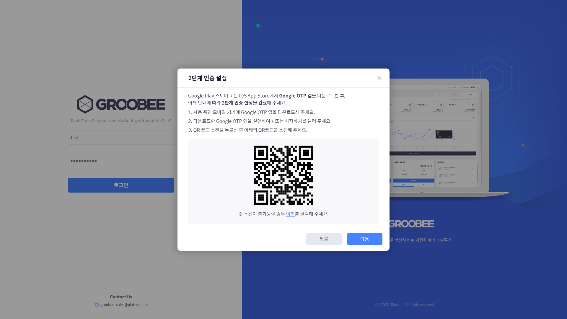 초기화된 부관리자 계정은 로그인 시 2단계 인증을 등록하라는 메시지가 표시됩니다.