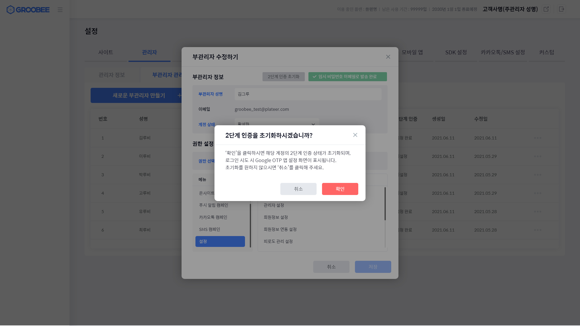 주관리자는 '설정 > 관리자 > 부관리자 관리 > 부관리자 수정하기' 로 가서 '2단계 인증 초기화' 버튼을 선택한 후 '확인'을 클릭합니다.