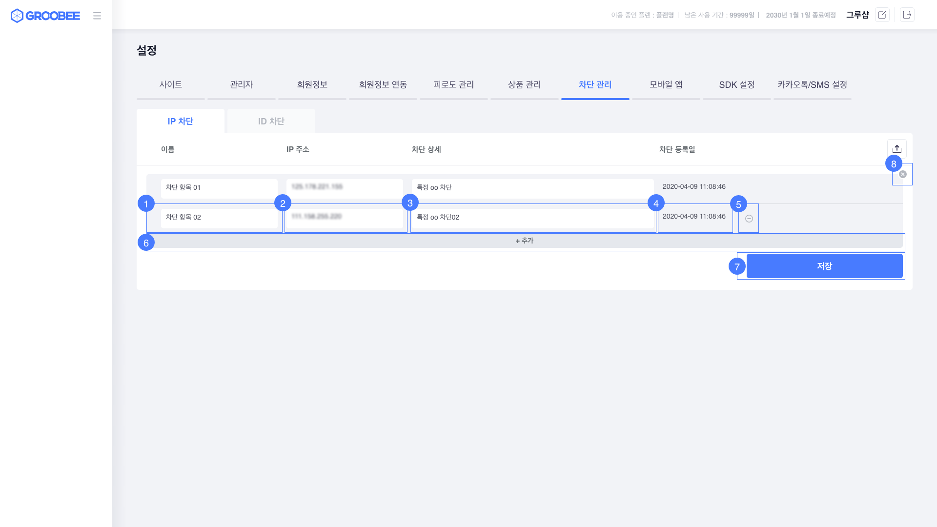 차단 등록일 : 저장돠 동시에 해당 IP주소가 차단되어 등록일을 확인할 수 있습니다.