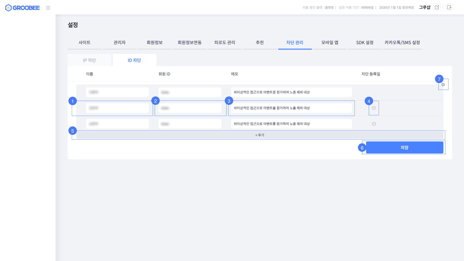메모 : 해당 ID가 차단된 사유를 간략하게 입력할 수 있습니다.