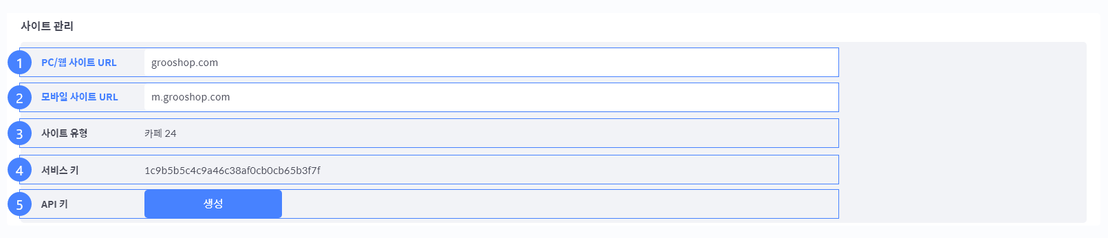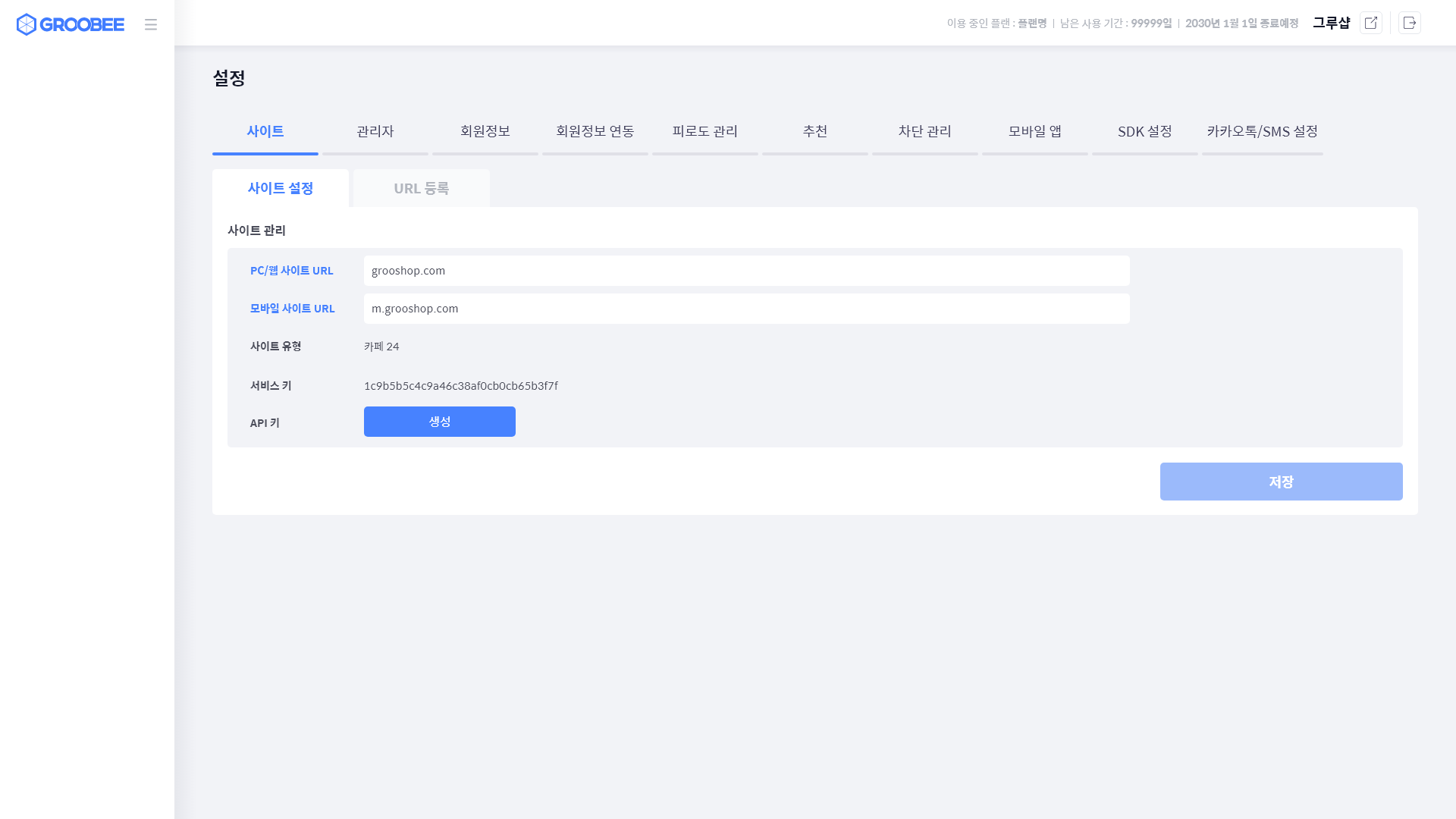 사이트 설정에서는 서비스에 연관된 사이트 URL 및 API 키를 발급 받을 수 있습니다.