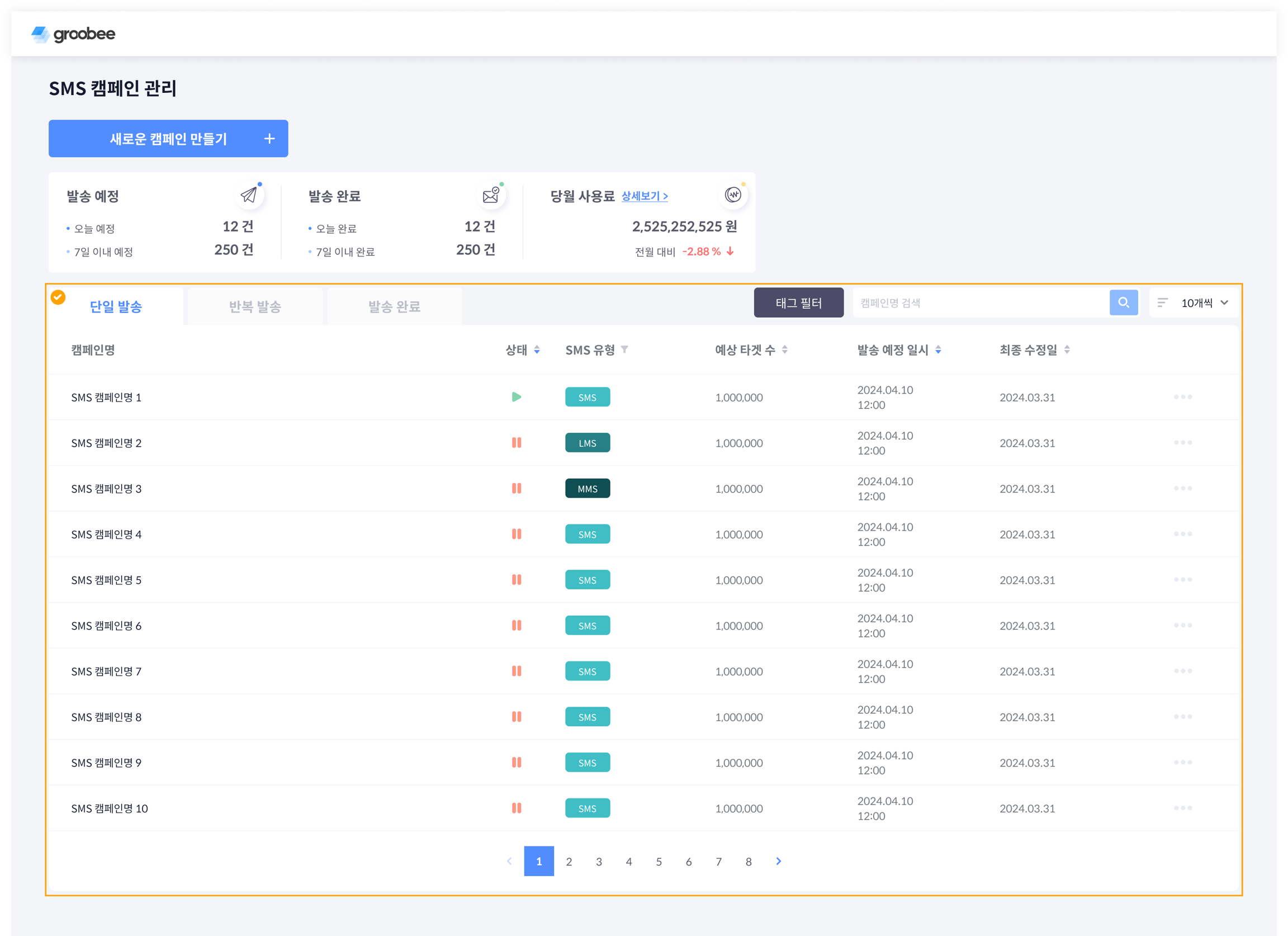 SMS 캠페인 관리 페이지에서는 새로운 SMS 캠페인을 만들고, 생성한 SMS 캠페인을 관리할 수 있습니다.