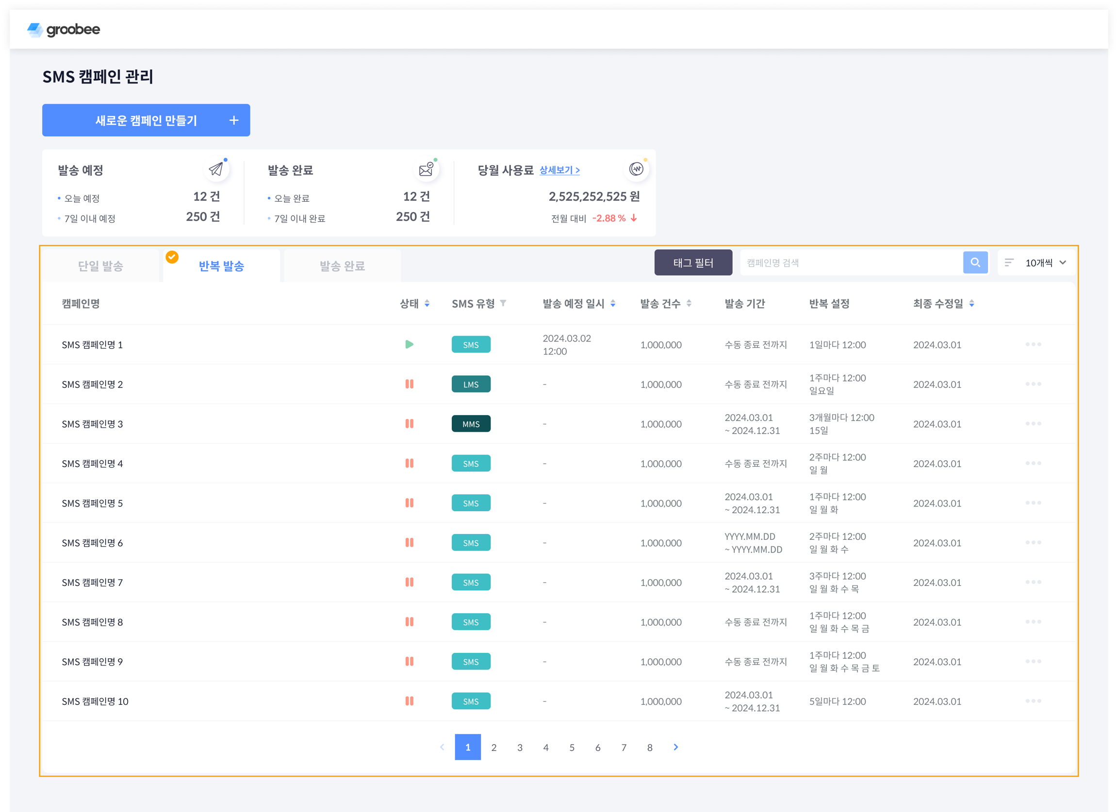 SMS 발송 유형별(단일 발송, 반복 발송, 발송 완료) 캠페인 리스트, 발송 예정, 발송 완료, 당월 사용료를 확인할 수 있습니다.