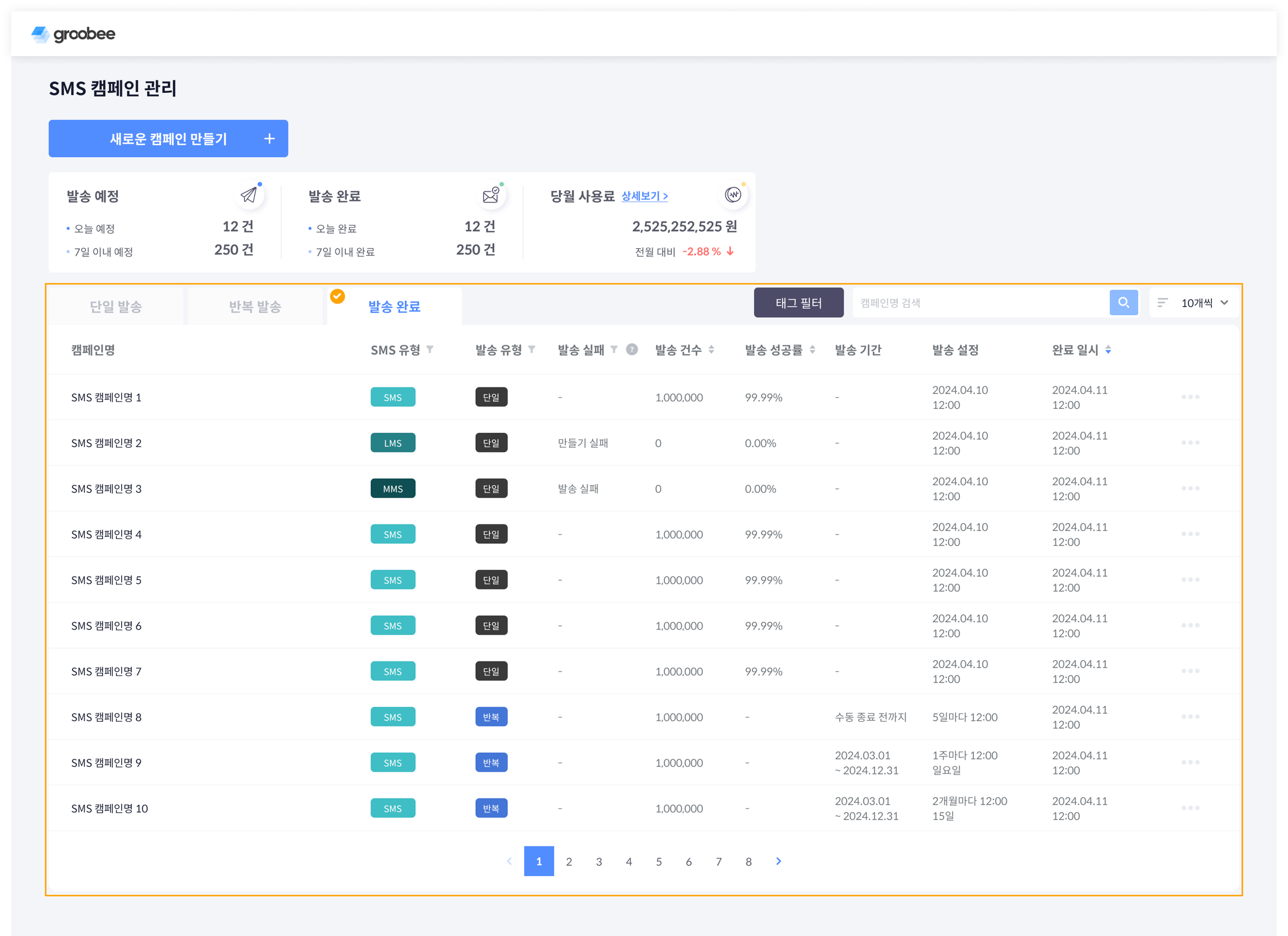 발송 완료 : 발송 완료된 SMS 캠페인을 확인할 수 있습니다.